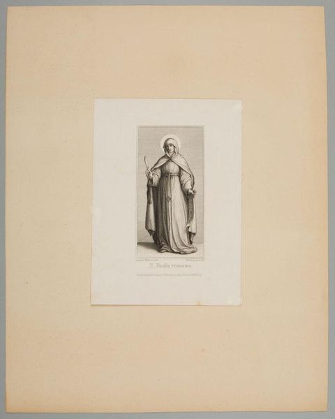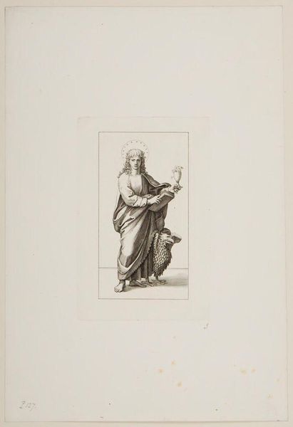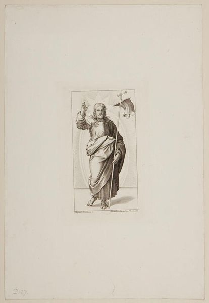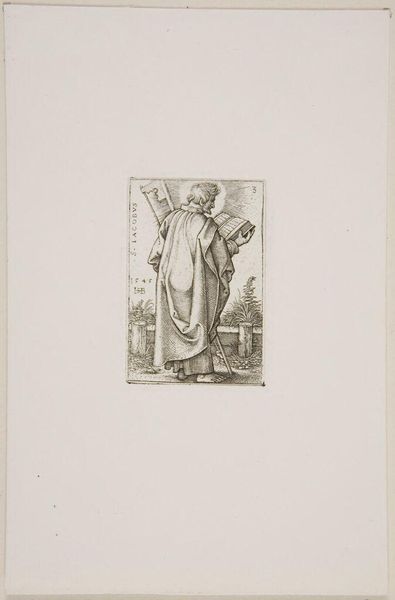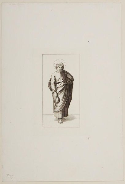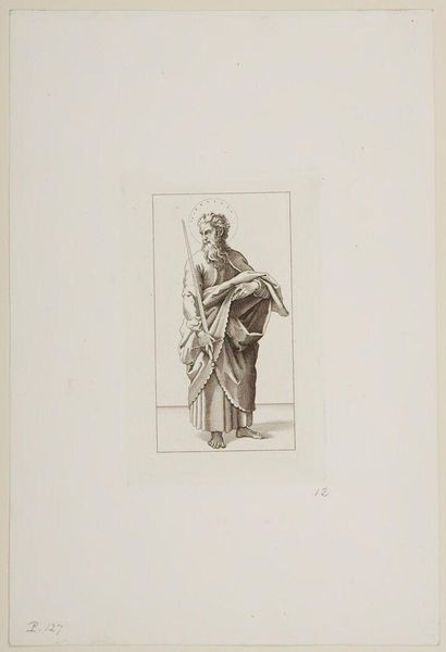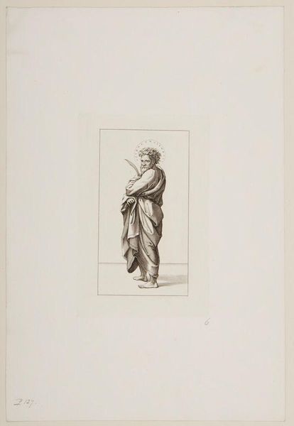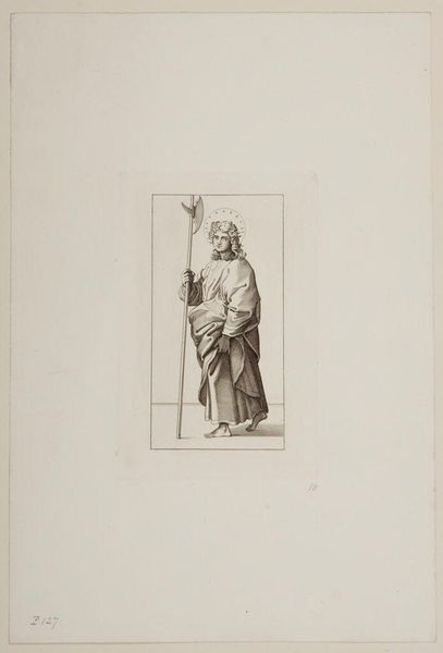 Curator: This is a print from the series, "Christ and the Apostles," by Ferdinand Ruscheweyh. What strikes you first about it? Editor: The halo seems almost apologetic, so faint. And is that a saw he's carrying? It all feels… surprisingly domestic. Curator: Legend says that Simon the Zealot, depicted here, was martyred by being sawn in half. It’s about tools of labor becoming instruments of oppression and death. Editor: Right. It’s unsettling how easily those lines blur. And the way Ruscheweyh renders Simon, the drape of his robes, it's classical, idealized, yet he carries this brutal reminder. Curator: He embodies the tension between the sacred and the profane, a timeless struggle, I think. Editor: Absolutely, a tension that continues to resonate in our understanding of faith, work, and resistance.