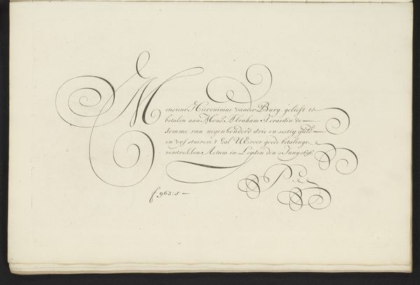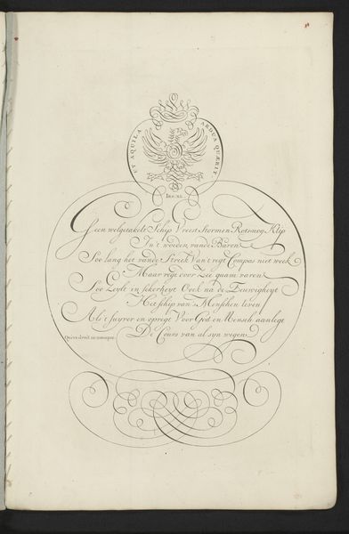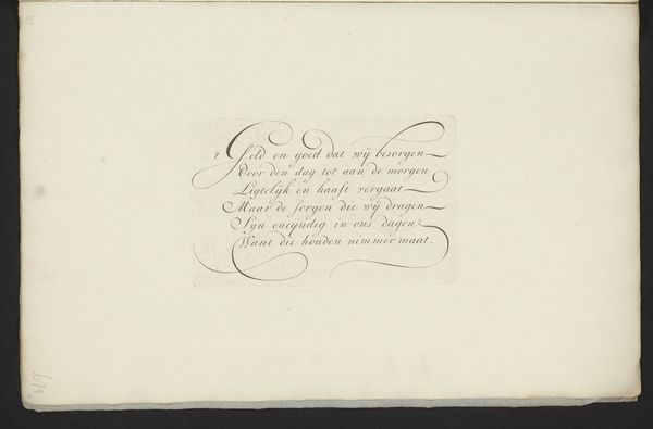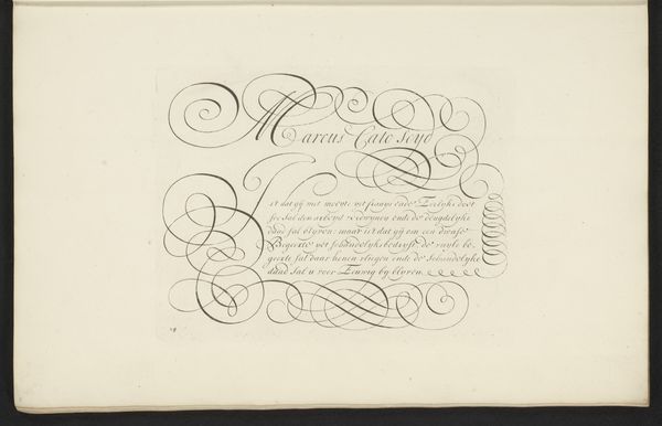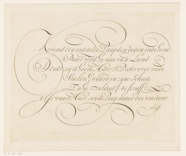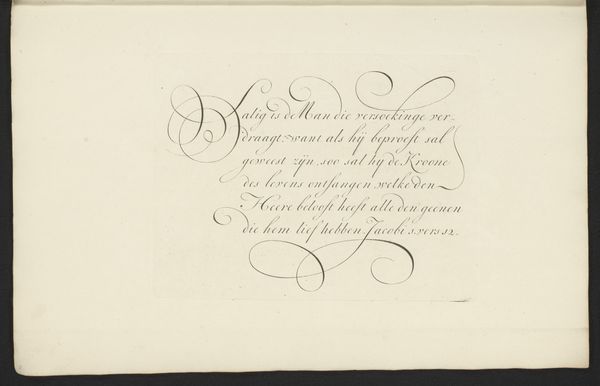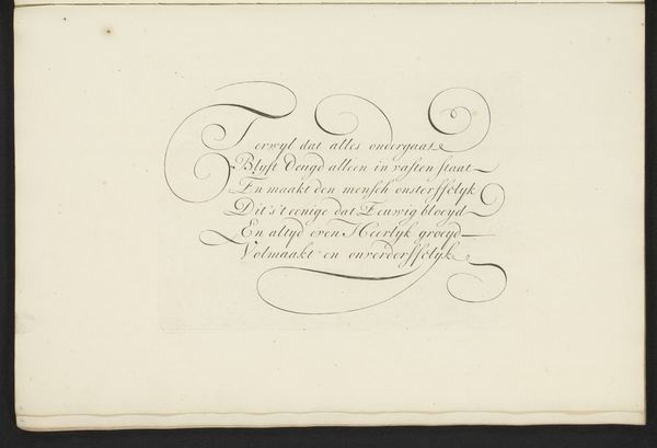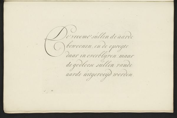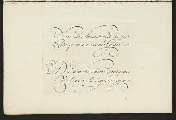 Bastiaan Boers created this elegant calligraphic work, “Schrijfvoorbeeld: Die trots is van gemoed,” using ink on paper. The eye is immediately drawn to the flowing, ornate script, which dominates the composition. The lines swell and taper, creating a delicate dance between thick and thin strokes, a characteristic of the Dutch calligraphy of the time. The overall effect is one of restrained elegance. The text itself, divided into two stanzas, is not merely informational, but becomes a visual element through its arrangement and the inherent beauty of the lettering. The negative space around the text is as important as the inked lines, providing balance and allowing each word to breathe. The script's rhythm—its curves and loops—suggest a deep connection to both formal aesthetics and the cultural codes that valued such refined craftsmanship. Consider how the artist uses the semiotic system of calligraphy to challenge fixed meanings, inviting viewers to contemplate not just the literal words, but the artistry embedded within each stroke. It serves as a powerful reminder that art is always open to ongoing interpretation, engaging us in a discourse far beyond its immediate aesthetic appeal.
