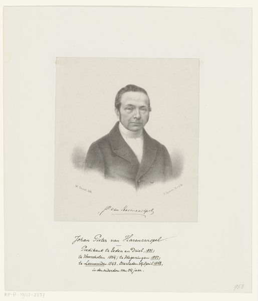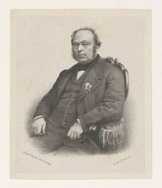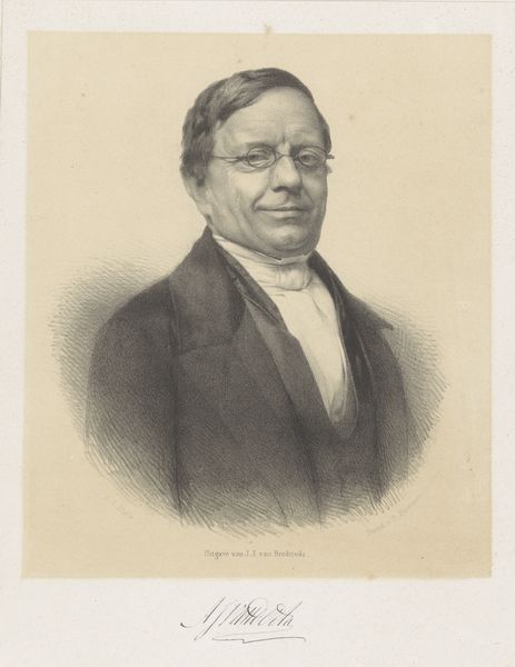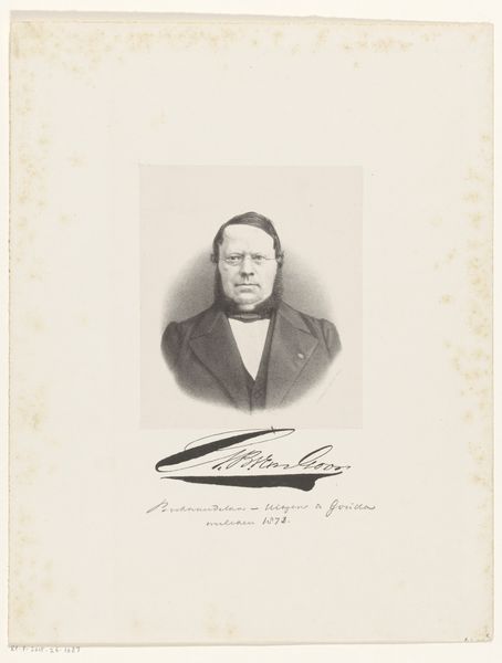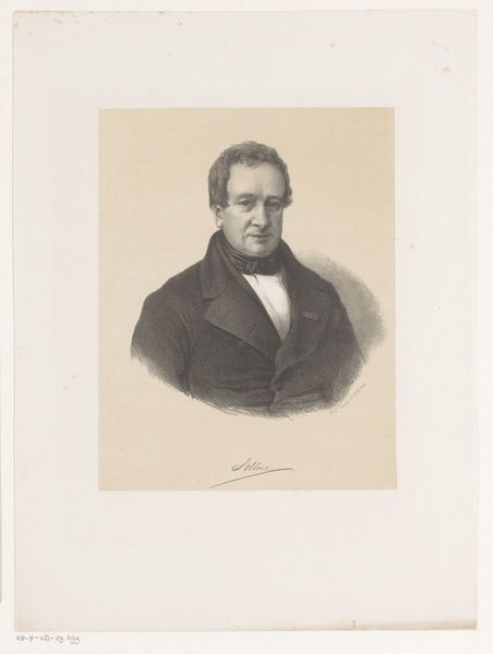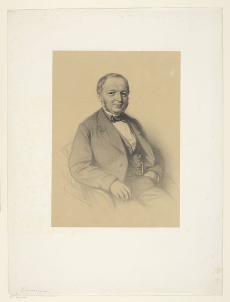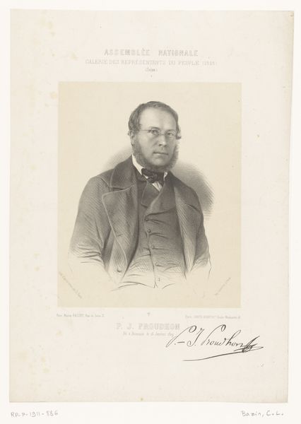 Editor: So this is a print from somewhere between 1840 and 1855, a portrait of Pierre-Joseph Proudhon. There's something very serious and almost confrontational about his gaze. What can you tell me about this image? Curator: Well, given that timeframe, it's essential to place Proudhon within the rise of socialist thought and his own complex position within it. What does his attire and presentation suggest about his social standing or desired self-representation, considering the turbulent political climate of the 19th century? Editor: He looks quite bourgeois actually, with his coat and bow tie, almost respectable. How does that square with his socialist views? Curator: Exactly! That tension is key. Proudhon was famously critical of both capitalism and communism, advocating for a kind of worker-controlled mutualism. This portrait, in its somewhat conventional depiction, becomes an interesting site of negotiation. How might this image, as a mass-produced print, have circulated amongst different audiences, each potentially interpreting it differently? Editor: That's a really interesting point. So, it's not just about what Proudhon wanted to project, but also about how different people received and understood that message based on their own social positions. Curator: Precisely. And thinking about the broader context, consider how photography and printmaking were evolving at this time. This portrait democratized access to Proudhon's image. How might the accessibility of such images influence political discourse and the formation of public opinion? Editor: It's almost like a proto-meme, spreading ideas and sparking conversation. Thinking about the historical and social context makes the portrait so much more dynamic than just a picture of a man! Curator: Agreed. Examining the interplay between artistic representation and socio-political context reveals the depth and complexities embedded in this portrait.