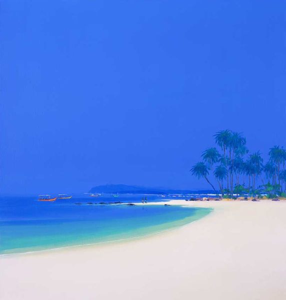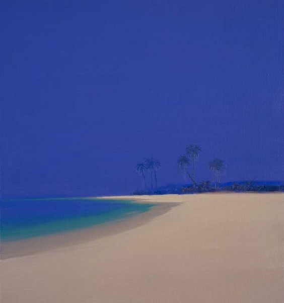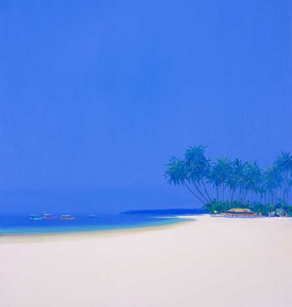 John Miller created this painting, “Beach – Goa,” using oil paints on canvas. Although these are traditional materials for fine art, Miller’s application is surprisingly flat and reductive. The way he applied the paint is interesting: solid blocks of color, seemingly without brushstrokes. The large expanses of light hues imbue the artwork with a sense of calm. In a way, this canvas feels like a manufactured image, a meditation on modern modes of production. Miller seems to be drawing attention to the work involved in creating an artwork, emphasizing its artifice. This approach challenges traditional notions of artistic skill. It makes you think about labor – not just the labor of the artist, but also the labor of the people who make the materials themselves. Ultimately, "Beach – Goa" invites us to appreciate the many layers of making that go into creating any work of art, blurring the lines between fine art, craft, and the broader world of production.