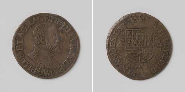 Curator: Let’s explore this intriguing coin, or "rekenpenning," from 1616. It commemorates the "Vastberadenheid," the determination, of Albrecht and Isabella of Austria in their claim to the county of Jülich. Editor: My first impression is that this coin, despite its age, feels incredibly dense with information. The relief is shallow but there are all of these heraldic details that suggest layers of meaning beneath the surface. Curator: Absolutely. These rekenpenningen weren't just money, but tools of propaganda and bookkeeping. Commissioned by the Brabant chamber of accounts, this medal was probably distributed among officials. They are part of Baroque representations of political authority. Editor: The central image on one side depicts a complex crest, surmounted by a crown. That definitely speaks to power and lineage. I’m curious about the various symbols within the shield—what did they represent? What claim were they asserting? Curator: That complex crest would need someone familiar with heraldry to decode completely. As you can see, the images relate to different regions and family claims combined into one statement. The coin, as a piece of state-sponsored media, publicly promotes the legitimacy of Albrecht and Isabella’s claim amidst complex succession disputes of the time. Editor: I see, it’s a public demonstration, encoded in symbols. That's something a modern viewer might not immediately grasp – the visual language of power and legitimacy so different from our own. It also humanizes history: the story behind this medal speaks of real power struggles, influencing the course of the land. The history of places represented on this coin! Curator: And it wasn't just the nobility who would get to see those symbols. Coinage reached everyday people through exchanges for labor and goods, and these images helped reinforce their position in the societal order. Editor: It makes me think of the power of small objects to carry enormous symbolic weight. This isn’t just a metal token, but a concentrated burst of political messaging, preserved across centuries. Curator: Indeed. A tiny object telling a monumental story of politics, identity, and resilience. Editor: It shows how important these visual icons of power can be.
