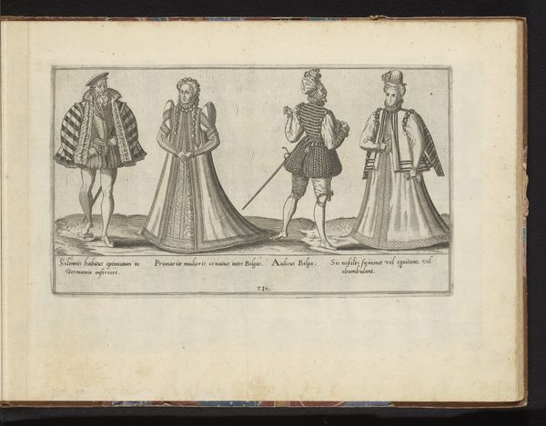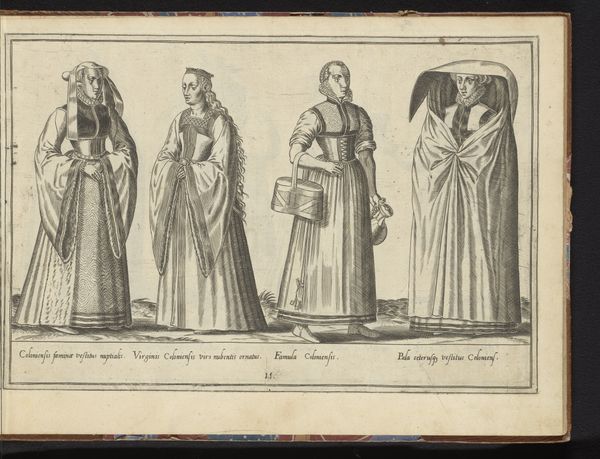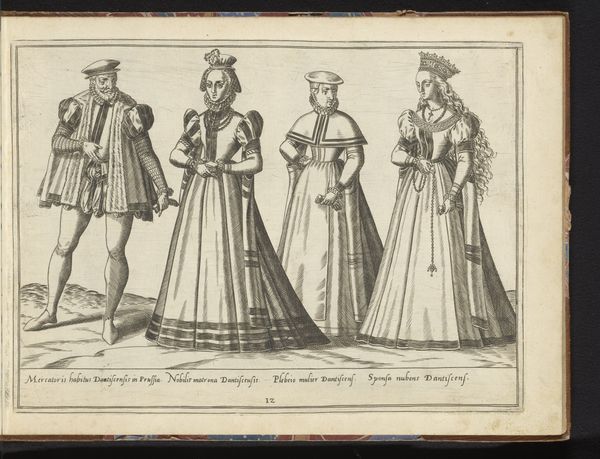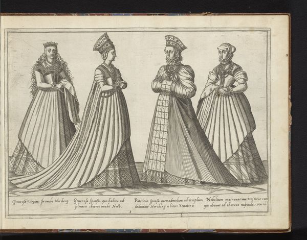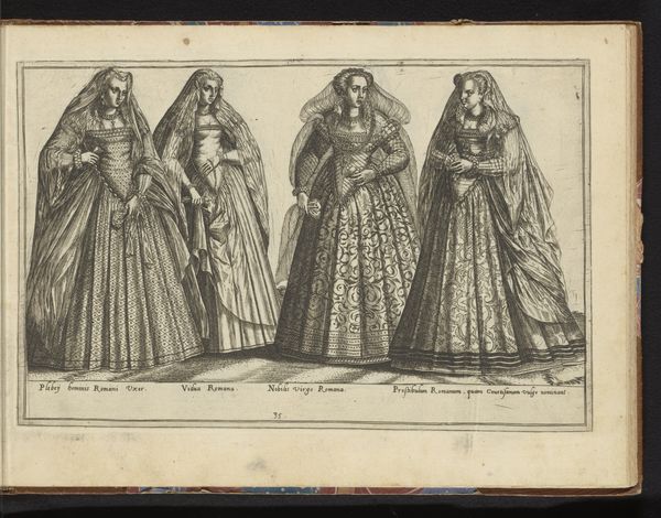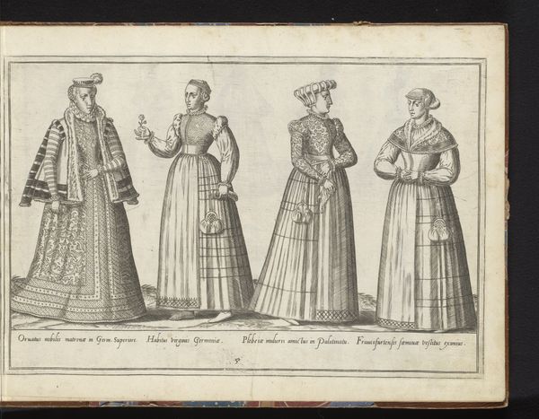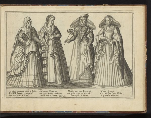This print, made around 1580 by Abraham de Bruyn, depicts four women dressed in the Italian fashion of the time. The printmaking process itself - likely engraving or etching - is key to understanding this image. Consider the labor involved: the careful scoring of lines into a metal plate, wiped with ink and then pressed onto paper. This was a reproductive technology, allowing images to circulate widely. Here, fashion itself is being put into production, with the garments rendered in exquisite detail. Notice the layered textures, patterns, and the sheer volume of fabric. These materials speak to a culture of consumption and display, accessible only to the elite. The image’s purpose was likely to disseminate these styles, feeding a desire for luxury goods and reinforcing social hierarchies. By focusing on the material culture represented here, we can see how printmaking played a role in shaping early modern notions of identity and status. It collapses any high/low distinction.