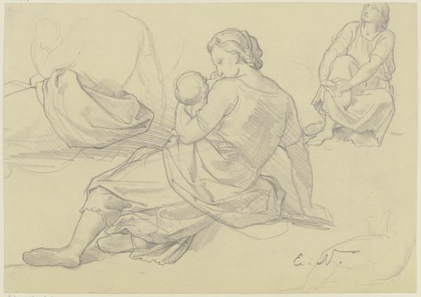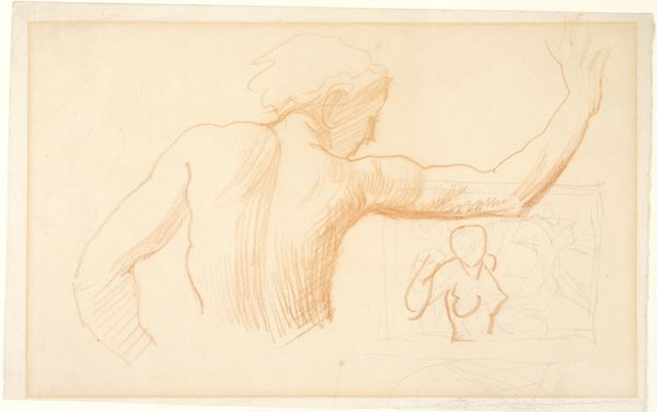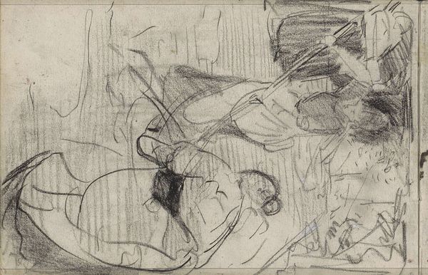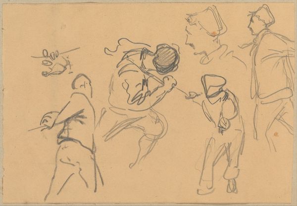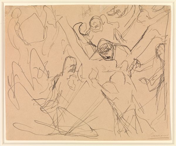 Editor: Here we have "Two Men with Clenched Fists," a pencil drawing by Leo Gestel, created sometime between 1891 and 1941. I find the sketch almost unsettling; the figures are incomplete, yet their stance conveys so much tension. What do you see in this piece that stands out? Curator: The most compelling aspect is Gestel’s economy of line. Notice how he suggests form with such sparse strokes. The clenched fists themselves become focal points, defined by the negative space around them rather than laborious shading. It's an intriguing exercise in reduction. Do you perceive a narrative element suggested by the figures' posture? Editor: Perhaps a struggle? They seem poised for action, although it’s ambiguous. What’s interesting is that Gestel leaves so much unsaid, demanding that the viewer fill in the blanks. Is there any deliberate contrast created in the composition? Curator: Absolutely. The rough, unfinished quality of the figures is set against the subtle contours of their implied presence. Also, there is a directional tension – note how one figure leans forward more assertively than the other, even in such a minimalist sketch. Gestel manipulates the composition to establish an asymmetrical tension. It appears unplanned, and, though in fact it probably was well planned, evokes a powerful dynamism through deliberate contrast. Editor: So the deliberate choices Gestel made with line, form, and composition contribute to the emotional impact. Curator: Precisely. By examining the pure visual language of the work, we unveil its potency beyond any superficial reading. Editor: That’s fascinating! It really pushes me to appreciate the artistic decisions beyond the surface representation. Curator: And that’s the power of formal analysis – to unlock meaning through careful observation of artistic choices.