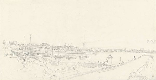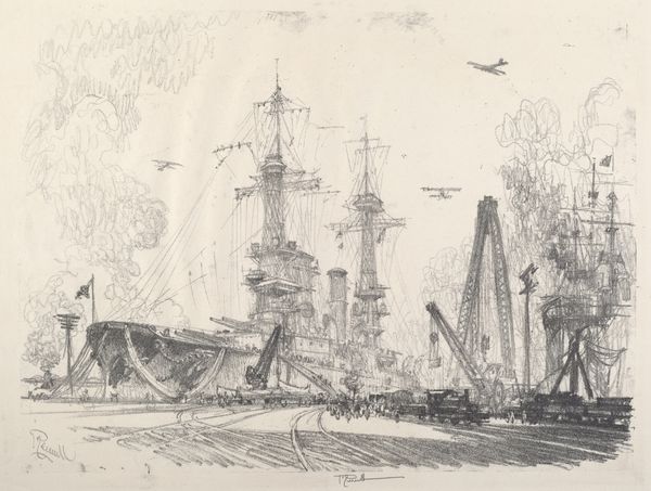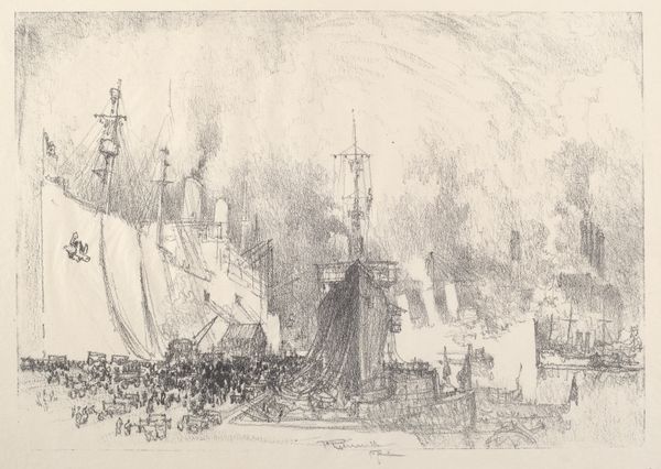Editor: Here we have Joseph Pennell’s "Oberbaum-Brucke, Berlin" from 1921, created using ink drawing and printmaking. It’s such a bustling cityscape, rendered in these incredibly fine lines. What strikes you when you look at this print? Curator: The lithographic process itself is compelling here, especially given the social and economic context of Weimar Germany. The mass production of images – think of the affordability of newspapers and illustrated magazines at the time – democratized visual culture. This print, seemingly a straightforward cityscape, participated in a broader circulation of information and ideas. Editor: So, you’re seeing the medium itself as a key component of understanding the work? Curator: Precisely! Ink wasn’t just a medium for artistic expression; it was integral to mass communication, to disseminating propaganda, to forging a collective identity in a fractured post-war society. Consider also who would purchase and consume a cityscape in a time of extreme social strife? It highlights not only consumerism but a desire to grasp a new German identity post-war. Does the artist make this apparent or further obscured? Editor: That's fascinating. It makes me think about how Pennell chose this particular subject too. It isn’t some romantic countryside view. He picked a modern scene. Curator: Exactly. It shows how artists can capture their social contexts through technique, production, and subject matter all in one work, right? What does that production and medium reveal to us, beyond a representational view? Editor: Absolutely. Looking at it that way really changes my understanding of this piece. Thanks for pointing that out.