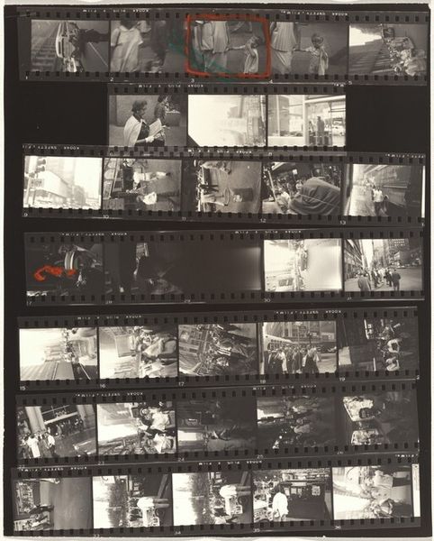 Curator: Here we have Robert Frank’s "Guggenheim 102/Ford 25--Detroit," a contact print from 1955. Editor: At first glance, I'm struck by the fragmented, almost chaotic presentation. It's not a singular, polished image, but rather a raw document of photographic labor. Curator: Precisely. Frank is presenting us with a series of images on a contact sheet, disrupting the conventional experience of the photograph. The frames, sprockets, and marginalia become integral parts of the composition. We see marked frames, an array of possible captures in assembly plants of automobile manufactory. Editor: Thinking about the Ford factory, I immediately consider the physical toil represented—the repetitive actions, the working conditions. The material here isn't just the photographic paper; it's the steel, rubber, and human sweat that went into building those cars. Curator: True, but Frank's choice to display this as a contact sheet asks us to consider the construction of meaning itself. Each frame offers a slightly different perspective, a varied interpretation of the same subject. How the photographer and his process creates this impression becomes apparent, and perhaps a meaning of its own. Editor: The images reveal the intense labor but are viewed indirectly, through the artist's hand, in its own fragmented way that draws our focus back on Frank. And in using a seemingly direct, 'unfiltered' document of a process, we also acknowledge how much labor it requires to simply manufacture an image! Curator: Ultimately, "Guggenheim 102/Ford 25--Detroit" complicates the traditional notions of photography, industrial work, and meaning by foregrounding structure and the act of looking itself. Editor: A truly insightful image that offers a window not only into Detroit's past, but also into the artist's own working method.