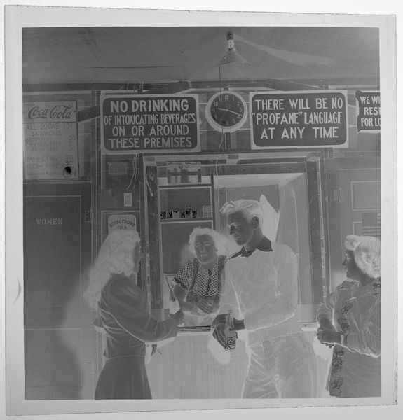 Curator: This is an untitled photograph by Hamblin Studio, depicting the interior of Handell and Brinkley Electric Co. The image, at just over 10 by 12 centimeters, presents a surprisingly detailed scene. Editor: It feels like stepping back in time. The clustering of vintage signs and electrical appliances creates an aura of early 20th-century commercial optimism. Curator: Notice how the composition guides the eye? The checkered floor leads to the back, where a figure stands almost as a focal point, yet the hanging lightbulbs draw the eye upwards. Editor: The lightbulbs are such potent symbols of progress, aren't they? This space is saturated with the promise of modernity and the transformative power of electricity. Curator: Indeed, but even within this apparent positivity, we see the rigid geometry of the signs and the ordered arrangement, suggesting a controlled, almost sterile environment. Editor: Perhaps it reflects a transition from simple craftsmanship to mass production. These objects are not just practical tools; they're artifacts imbued with cultural aspiration. Curator: A fascinating interplay of form and symbol. Editor: Yes, it tells a story without words, really.