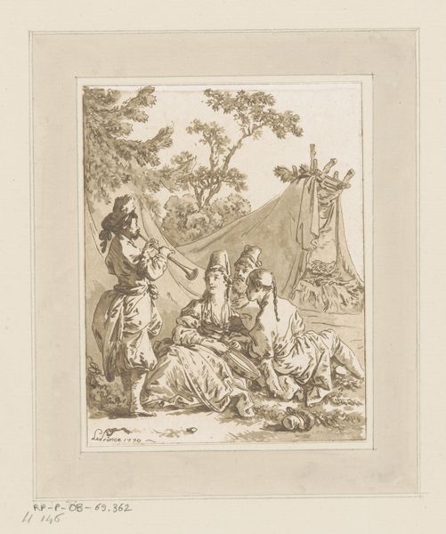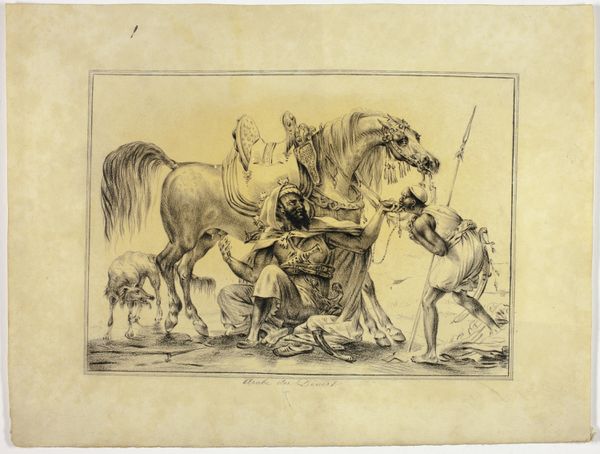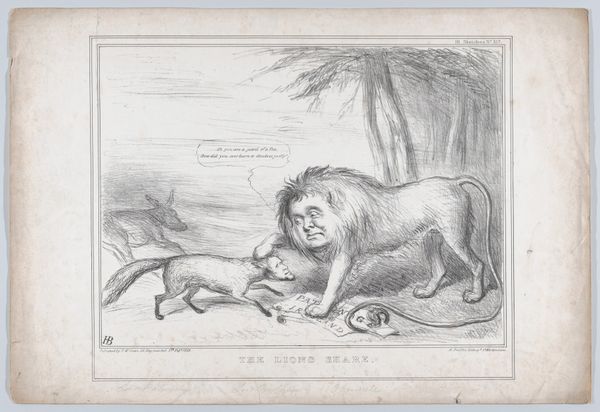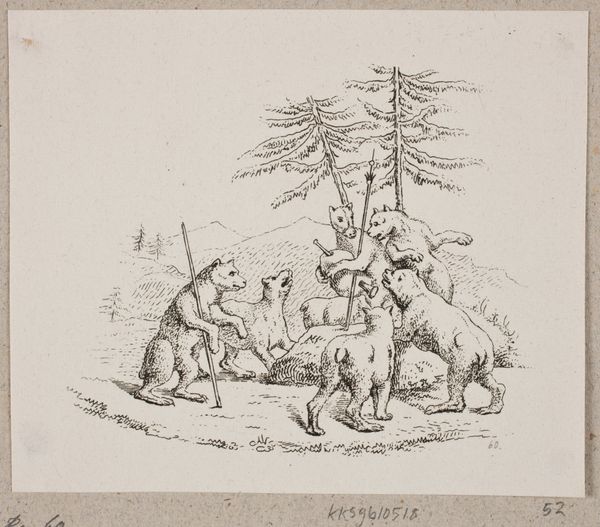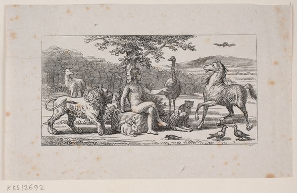 H.P. Hansen made this trial print for Christian Winther’s ABC book using engraving. Immediately, your eye is drawn to the harmonious composition, with all the animals, each carefully delineated with cross-hatching, gathered peaceably around the central figure of the man. Engraving, with its reliance on line and form, offers a structured approach to representing nature, imposing order upon the animal kingdom in a way that reflects the human desire to categorize and understand the world. The visual organization here is crucial. Hansen's composition invites reflection on how we classify beings and exert our influence over the natural order. Consider the implications of presenting the man as the focal point in the animal kingdom. It highlights a conceptual hierarchy and raises questions about our relationship with nature. Hansen’s work isn’t just an illustration; it's a commentary on human-nature dynamics, prompting us to reflect on our role in shaping, representing, and ultimately, understanding the world around us.