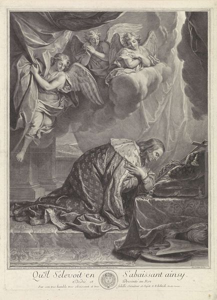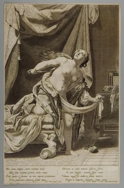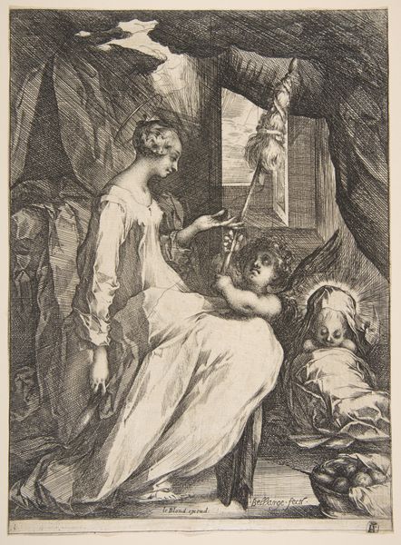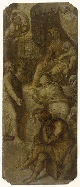 Editor: We're looking at "Illustration for an Eastern Romance, possibly ‘The Arabian Nights’" by Robert Smirke. The medium appears to be drawing, perhaps with charcoal and other media on toned paper. The monochromatic palette definitely creates a dramatic mood. I’m curious, what catches your eye, what stands out about its composition? Curator: Primarily, the dynamic interplay between light and shadow structures the narrative. Note the sharp contrast delineating the figures, highlighting the tension. Smirke masterfully utilizes chiaroscuro to guide our gaze and amplify the emotional intensity. The diagonal composition also draws attention, does it not? The artist positions the main figures creating opposing vectors. How do you feel this dynamism influences the way you understand the subject matter? Editor: I do notice the angles and the woman reaching. So, do you mean that those diagonal lines make it feel almost unbalanced? Curator: Precisely. This strategic disequilibrium contributes to the sense of drama, a key element in the narrative. Furthermore, the tonal gradations aren’t merely decorative; they delineate form and evoke a specific atmosphere. We can consider that his style underscores an inherent dramatic narrative within the pictorial elements themselves. The artist presents it, but what is your reading? Editor: That's insightful. I see how the formal aspects really emphasize the storyline. Thanks, that makes me look at it from an unexpected viewpoint! Curator: Indeed. It is within the careful manipulation of line, light, and form that the artwork truly speaks. I hope this helped with appreciating his craftsmanship.