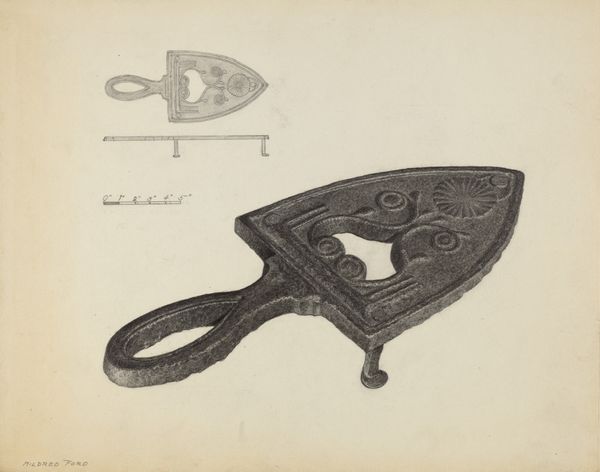 Curator: Here we have Elmer Weise’s pencil drawing titled “Bootjack,” created around 1937. What strikes you first about it? Editor: Immediately, I'm drawn to the composition—the two bootjack views arranged vertically, the crisp linework contrasting against the plain background, giving it a real sense of objecthood, almost sculptural. Curator: It's intriguing how Weise has elevated this everyday object. We have to think about how bootjacks served an important role, assisting with the removal of work boots and embodying aspects of labor. In making this, Weise asks the viewer to contemplate material culture of a specific time. Editor: True, but I can’t help focusing on how beautifully observed these objects are. Look at the precision in rendering the light and shadow, and the subtle gradations that give the metal weight. The formal elegance transforms a purely functional item into a thing of beauty. Curator: Absolutely, and I think that duality between function and form opens interesting dialogues on the social conditions for making such an item, because the form, and the very need to illustrate it, suggests certain level of specialized industrial output that allows Weise the very opportunity to document it. It transcends utility alone, becoming an artifact worth contemplating through the artistic labor of documentation. Editor: It makes me think about realism as a conscious aesthetic choice. The bootjack almost appears to float within its space—its presentation invites a semiotic reading where negative space plays into a reading of function versus image. The artist encourages us to decode it. Curator: Yes! What this work and other "realistic" drawings often do is really foreground a changing relationship with material reality. New manufacturing techniques in the 30s increased the proliferation of "everyday objects," changing its relationship with labor. The formal attention is, in itself, an embrace of material abundance. Editor: The way that line work gives way to soft shading on some curves reminds us, again, that what may look ordinary holds a great deal of nuanced consideration when you look closely. Curator: Absolutely, seeing an image like this prompts reflection on consumerism, and how seemingly insignificant things carry bigger socio-economic echoes. Editor: I leave with a reminder to always see value in observing everyday things with purpose.