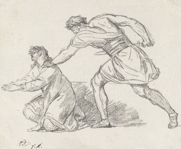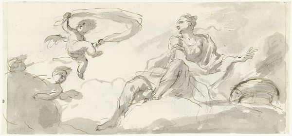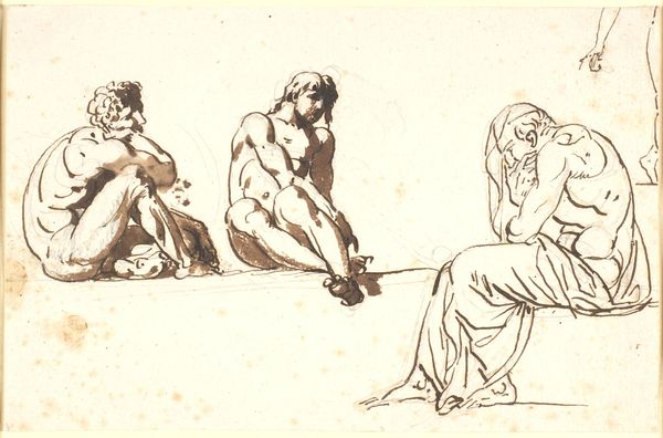 Curator: So this graphite drawing, dating back to between 1775 and 1780, is titled "A River God and Two Classical Sculptures" by Jacques Louis David. Editor: It looks…dusty. In the sepia tones I can sense both great beauty but it feels like that’s buried beneath a melancholic fog of bygone empires. The way he positions them, they're more ghosts than gods. Curator: Yes, that's interesting, the artist really pulls from Neoclassicism. Do you notice the symbolism in the idealized figures and how they evoke classical antiquity's aesthetic and themes? Think about what those historical references might signify here. Editor: Totally! There is a deep stillness in this artwork. They aren’t moving at all! Everything about it feels heavy, weighed down, frozen like those moments we try to mentally hold on to before time snatches them away. It also brings to mind some interesting archetypes...a male deity reclined but also in charge, versus a passive maiden. Curator: A fitting parallel to prevailing norms within Classicism. Now, David seems to be consciously echoing established systems of representation; it serves his purpose. Considering what else we know of David, it’s tempting to read this classical imagery as foreshadowing the kind of civic virtue that propelled revolutions later. Editor: Do you think it’s intentional though or that we apply such notions in hindsight? It’s lovely but perhaps, because of its restraint, it’s difficult for me to see the kind of revolutionary sentiment usually attributed to David. Curator: Perhaps a bit of both! Either way, these forms and motifs had particular resonance back then, and retain some emotional charge even today. It's a potent recipe for cultural memory and transmission. Editor: Makes you think doesn't it, how images ripple out across centuries like this pencil drawing. There is definitely more to unpack here; what we find personally often seems just the tip of some vast archeological dig into history, into meaning itself.