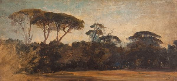 Curator: Looking at this landscape, painted sometime between 1859 and 1860, we see Jean-Jacques Henner's rendition of the Borghese Gardens as viewed from the Villa Medici in Rome. Editor: It’s striking how subdued the color palette is. It almost feels like a black and white photograph with the slightest hint of green and tan, casting a contemplative mood. Curator: Henner was deeply embedded in the artistic and political milieu of 19th-century France, a time rife with discussions about academic tradition versus avant-garde experimentation. Consider the historical context of French artists seeking inspiration and validation in Rome, often supported by state-sponsored residencies. Editor: The composition is fascinating. The rigid architecture of the Villa's balustrade is contrasted against the organic shapes of the trees. Does that tension reflect something about Henner’s own artistic struggles, straddling the line between the classical and something newer? Curator: I think you're right on the money. These gardens, symbols of leisure and cultivated nature, became charged spaces, didn't they? Rome became an interesting battleground where artists had the opportunity to grapple with the imposing weight of the classical tradition while developing their personal styles, or trying to push new artistic boundaries, that back then felt extremely radical, given the political status quo. Editor: Exactly! And plein-air painting – working outside, directly engaging with the light and atmosphere - also speaks volumes. It breaks down hierarchies; the artist is no longer bound to the studio, but present, engaging with lived reality in a fresh way. Curator: Think, also, of how access to these gardens, these villas, was itself a statement about social standing and the politics of patronage. Who got to look at this view, and from what position of power? Editor: Seeing the classical statue partially obscured in the painting is intriguing as well; is Henner indicating something by its secondary placement here? Is it an artistic act of defiance, where the natural landscape eclipses this cultural object? Curator: Possibly. I see that the gardens became sites where new artistic identities were negotiated amidst debates about tradition, revolution, and the shifting meaning of “landscape” itself. It reminds us that artistic choices, seemingly about aesthetics, are also intertwined with larger societal forces. Editor: This makes me think about how artists shape our perceptions of power structures. Seeing that vista presented as something observed but still out of reach tells its own tale. Curator: Indeed, Henner’s rendering allows for this kind of dialogue— it lets us grapple with these crucial issues, which makes experiencing it here today feel as exciting as when he painted it. Editor: A wonderful lens into understanding this pivotal period in art history.