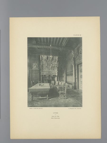 Editor: This is "Gezicht op de eetzaal van het Kasteel van Gaasbeek, België," or "View of the Dining Room of Gaasbeek Castle, Belgium," by G. Choppinet. Created before 1898, it appears to be a gelatin-silver print. The chessboard floor really jumps out. What's your interpretation? Curator: Well, immediately I consider the function of such a carefully staged photograph. It depicts an aristocratic space intended for display, reflecting the values of the owner and the role the Chateau plays as a landmark in its community. Consider the photograph itself – its creation and distribution served to solidify the Chateau's status as a site of power. Editor: So, it's more about image-making than just capturing a dining room? Curator: Precisely! We can think of photography, particularly images like this, as actively shaping historical narratives. The fireplace, the portraits, the table settings—these aren’t just decorations. They communicate wealth, history, and lineage. Who would this print be made for and how would it have been circulated? These are key questions. Editor: It's interesting to think about how a photograph can be an active player in social dynamics. It's not just documenting history, it's creating it! Curator: Exactly. The politics of imagery are deeply embedded in how we understand history, architecture, and the role of institutions. And that ornate chandelier suggests that electricity might be a brand new addition here. Editor: Thanks for opening my eyes to the stories behind the image. Now I'm really thinking about its place and time. Curator: It's all about looking beyond the surface! Thinking about photography as a deliberate statement allows us to see these historical settings in a new, dynamic light.