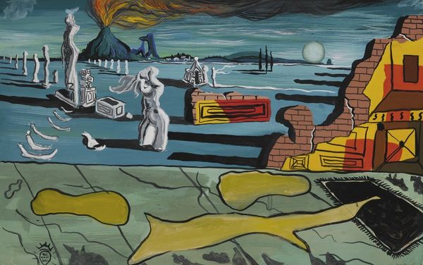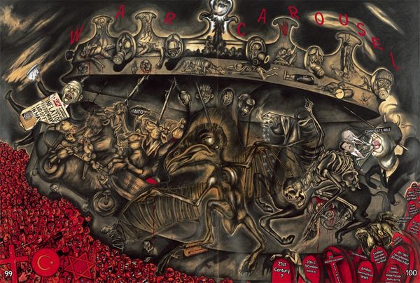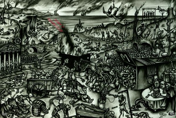 Editor: This drawing, titled "Tower" by Sue Coe, is done with ink on paper. It’s… unsettling. A chaotic scene unfolds beneath what looks like a collapsing tower, possibly a nuclear reactor. What do you see in this piece? Curator: This work speaks volumes about production, about how disaster, both environmental and social, is manufactured. The frantic activity suggests a breakdown in societal systems, the literal fracturing made tangible through the artist’s sharp, angular linework with the use of ink, a relatively inexpensive and widely available material reflecting its anti-art position. Editor: Manufactured disaster? Could you elaborate? Curator: Consider the material and technique here. Coe's use of stark black ink and dense, chaotic cross-hatching reflects a rushed, almost desperate, means of production. This speaks to the speed and recklessness with which such disasters, whether environmental, political, or social, are created. Even the scraps of text seem pulled directly from the headlines and the historical data itself, repurposed as part of her image to speak directly to how events can spiral. Do you see the city street? What does that addition of a city landscape suggest to you? Editor: It creates a kind of "everyday" setting where a disaster has disrupted, as the "street" element gives a social context and invites the public's interpretation. Are the figures shown to be trying to stop the events or simply experiencing their repercussions? Curator: Precisely, it asks who benefits and who suffers from these processes of creation and destruction? Editor: That's fascinating, thinking about it not just as a depiction of chaos, but as an analysis of production. Thanks! Curator: A vital distinction that is crucial when discussing material realities of such scenes.