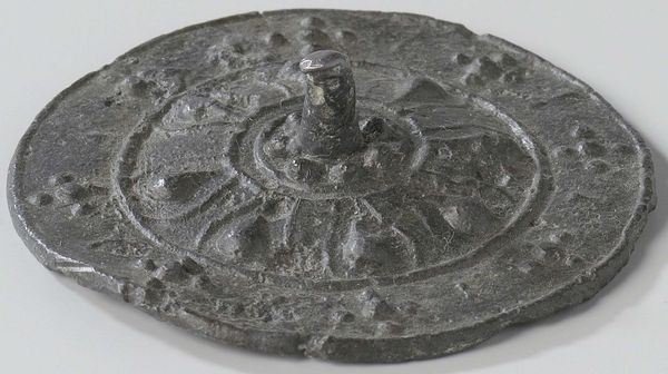 Curator: This is a replica of a 7th-century Merovingian Horseman Medallion. The original, of course, would have been from the Merovingian dynasty, a Frankish kingdom. What strikes you first about it? Editor: The rough texture and the dark patina give it a very primal, almost urgent feel. I see a stylized figure—what appears to be a horse and rider—surrounded by these openwork shapes. Curator: Yes, let's examine that. The composition is fascinating. The artist has used negative space to define the image, creating this dynamic tension between the solid bronze and the voids. Notice how the circular form contains and focuses the eye. Editor: I'm drawn to the horseman, a recurring symbol across cultures. In this context, it likely represents power, nobility, and perhaps even a connection to pagan traditions persisting in early medieval Europe. Curator: Precisely. The medallion’s form, scale, and material speak to its ritualistic function, revealing its cultural significance through purely visual means. Editor: It serves as a potent reminder of how symbols can transcend time, carrying layers of meaning for centuries. Curator: Indeed, the medallion's formal qualities amplify its symbolic weight, resulting in an object of lasting impact. Editor: A tiny object, yet capable of evoking vast cultural narratives.