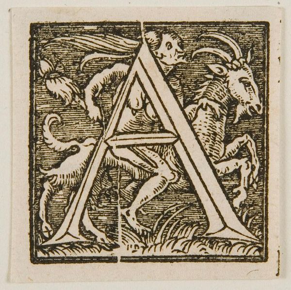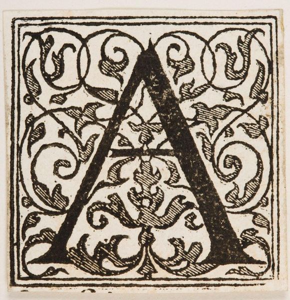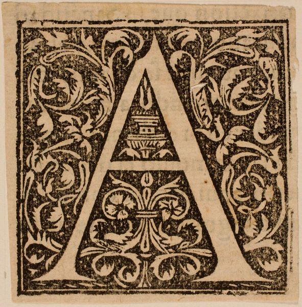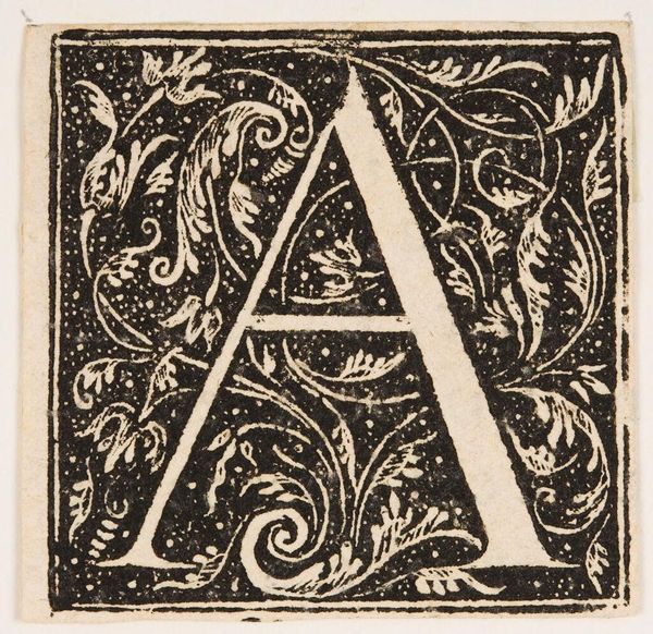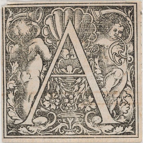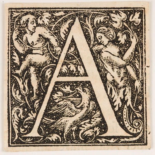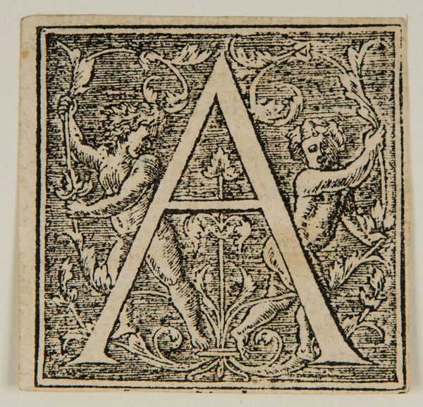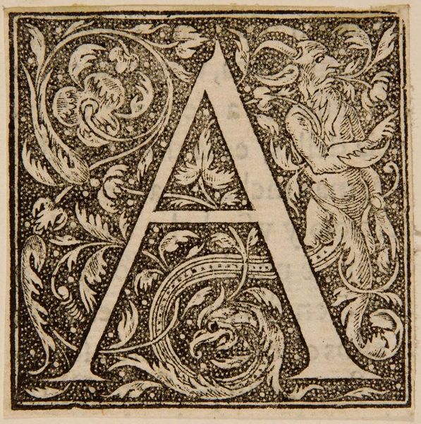 Curator: We're looking at an initial, "Letter A," by an anonymous artist, held at the Harvard Art Museums. It's quite striking, wouldn't you agree? Editor: Immediately, I'm drawn to the tension between the rigid letterform and the organic, almost chaotic, foliage. Is this tension intentional, a reflection of societal order versus the natural world? Curator: I think you're onto something. Consider the period; the rise of print coincides with increasing social stratification. This letterform becomes a tool, but the surrounding imagery hints at the wild, ungovernable elements that resist easy categorization. Editor: And what about the figure nestled within? A child, perhaps? Are they meant to be sheltered by the letter, or trapped within its confines? This is an ambivalent symbol, ripe with layers of interpretation. Curator: The ambiguity is key. The letter A, the beginning, but also a space of confinement, particularly for marginalized voices. I wonder what kind of statement the artist was trying to make with this imagery. Editor: It leaves me pondering the power of symbols and their ability to both define and confine us. Curator: Yes, a perfect beginning to a larger discussion.