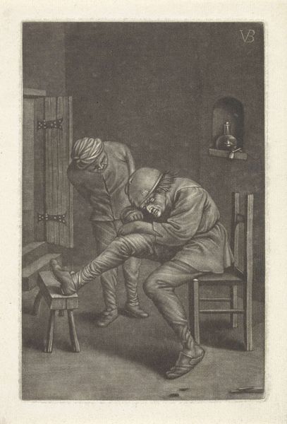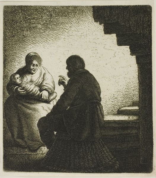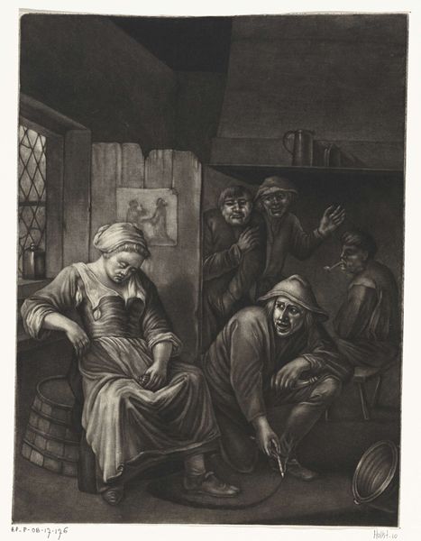 Editor: This is "Boerengezin" by Jacob Gole, created sometime between 1670 and 1724. It's an etching, a print, and it looks incredibly intimate, like a peek into a very private moment. What’s your take on it? Curator: It offers, ostensibly, a peek, yes, but also performs a specific kind of visual work for its likely urban audience. The image participates in a long history of representing rural life, but how “real” is it? What is idealized, romanticized, or, conversely, sensationalized? Editor: I see. So it’s not necessarily a straightforward depiction? Are there other things happening in the culture that would affect the messaging around this scene? Curator: Exactly. Consider the rise of the Dutch Republic and its economic prosperity at this time. Art served to define cultural identity. How do you think the art market may have played a role in making a genre scene like this one desirable? Editor: Hmm, maybe it provided a comforting narrative of humble, hard-working people that reaffirmed certain values? And perhaps owning it was a way of displaying those values, for a patron? Curator: Precisely. Prints, because they're reproducible, had a wider distribution than paintings and catered to that expanding market and the bourgeois aspirations. We see the Dutch Golden Age through images carefully crafted to reinforce its ideals. Editor: It’s really interesting how art isn’t just a reflection, but it also does real cultural work, shaping how people understand the world. Thanks for pointing out the cultural significance and art-market context; I'll remember that. Curator: My pleasure. It is a powerful lens to understand an artwork’s historical impact.