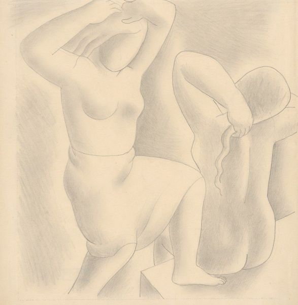 Curator: Here we have "Rear Pose," a 1937 drawing by Kaye Waters, primarily using pencil and charcoal. What catches your eye? Editor: Immediately, there's a sense of melancholy; the averted gaze and the subdued tones create a quiet, contemplative mood. It also has this somewhat odd abstract construction that almost seems modernist. Curator: I'm interested in the deliberate choice of medium here. The blending of pencil and charcoal allowed Waters to achieve a unique level of tonal gradation, particularly in rendering the texture of the skin and the draped fabric. Charcoal, historically affordable and widely available, also hints at a wider production and audience for this type of work in its time. Editor: I'm more struck by how she chose to portray this figure, the pose almost evokes vulnerability but also, in a sense, timelessness. The symbolism of the female nude, particularly from this perspective, can carry layers of meaning, from classical ideals of beauty to more personal, introspective themes. The cascade of hair acts like a kind of symbolic veil. Curator: Certainly, the handling of the drape introduces elements of texture and visual interest, highlighting her mastery of the medium but more fundamentally, the inclusion of fabric speaks to the industrial production involved. How the depicted cloth moves from loom to representation introduces questions of labour. Editor: What is so poignant is how it contrasts the fleeting nature of human existence, and human vulnerability. Its message feels especially charged, considering when it was made. Curator: Ultimately, what intrigues me most is how Waters transforms commonplace, industrial materials into a moment of perceived artistic skill, while at the same time using the symbol of a single model, laboring for their income. Editor: And for me, it’s that haunting feeling. A meditation on vulnerability.