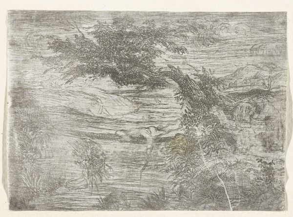 In the first version of the Landscape with a Waterfall Segers added shadows with hatching (Kupferstichkabinett, Berlin 963-13, RP-P-H-OB-825, RP-P-OB-826). Here, in the second version, the dark passages are the result of direct etching: parts of the plate were exposed to the etching acid, while the light passages were covered with stopping-out varnish.