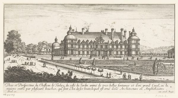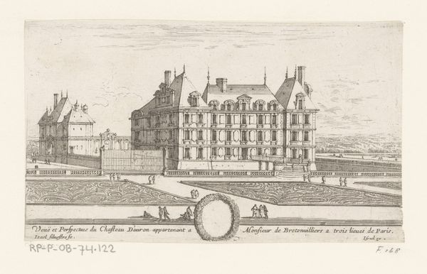 Editor: So, this is "Gezicht op het kasteel van Maisons," or "View of the Castle of Maisons," from 1654, by Israel Silvestre. It’s an engraving. It’s so…orderly! Almost obsessively so, with all those tiny lines. What do you see in this piece? Curator: Oh, the dance of lines! It's almost a mathematical proof of beauty, isn't it? For me, it whispers of control, a human taming of nature. It's that tension between the wild sky suggested by the light etching versus the castle’s rigid geometry that really pulls me in. Makes me wonder, what kind of life existed inside the chateau walls? What kind of control did they excert? Editor: Control...interesting. It feels so...planned. Did this fit into a particular artistic style? Curator: Definitely! This screams Baroque obsession with grandeur. Think of Versailles, that pursuit of total aesthetic dominance. Silvestre's line work serves not just to represent the place, but to project its owners’ mastery, real or imagined, over their domain. Do you feel a sense of movement or stillness when you look at it? Editor: Stillness, definitely. Except for maybe the tiny figures, but they almost emphasize how static the castle itself is. Curator: Exactly! Like ants crawling on a perfectly still leviathan. That contrast is, I think, quite powerful. Silvestre makes a statement with that contrast between stillness and activity, doesn't he? He’s letting us see two different ways of being in the world: The ants live short frantic lives; The Chateau remains immutable in comparison, a monument to those lives, maybe a reward. The artist suggests those frantic and still realities simultaneously. Editor: So, it’s not just a pretty picture. It's a whole power dynamic captured in lines. Curator: Precisely. It's a silent conversation about who commands the landscape…and by extension, their own destiny. Food for thought!