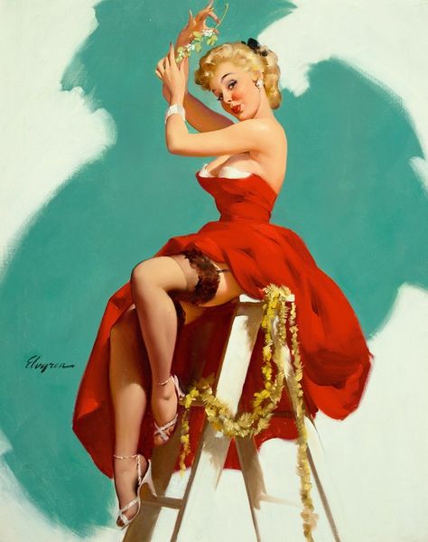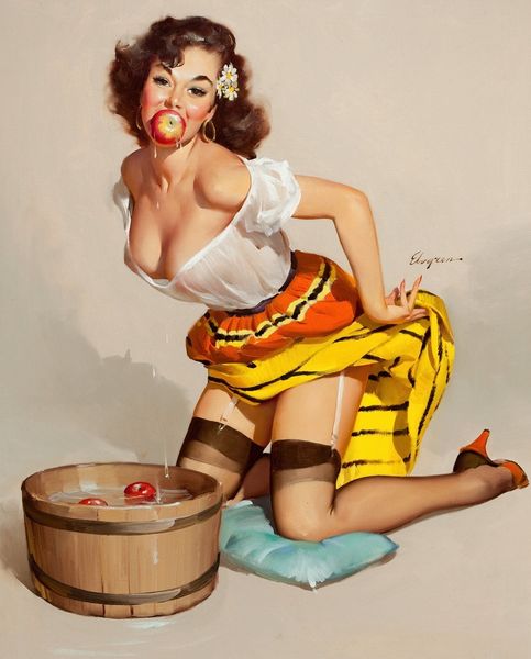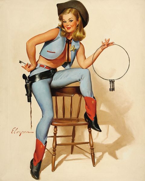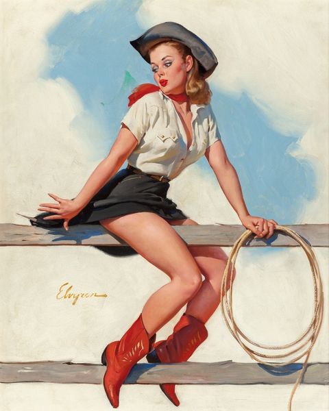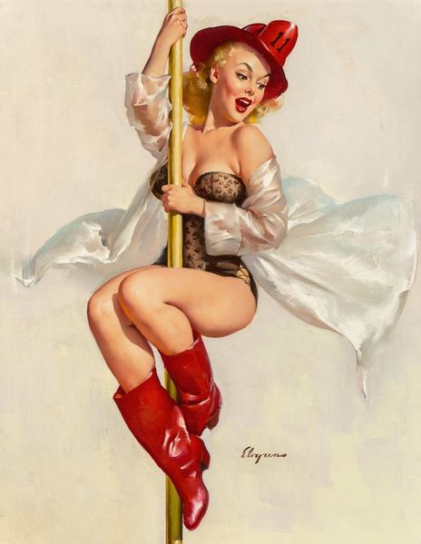 Editor: This is "A Polished Performance," an oil painting by Gil Elvgren from 1964. The woman is the obvious focal point. She has one foot on the ground, another perched on a stool, but also... resting on a guitar? The whole scene feels quite theatrical. What’s your take? Curator: Indeed. Note the strategic use of color. The bright, almost garish blues and reds draw the eye, creating visual anchors that guide our gaze through the composition. Consider how the soft curves of her figure are echoed in the rounded forms of the hat, the guitar body, and even the swirls of the boot's design. The geometry implies femininity. Editor: I hadn't noticed how the curves echoed! And it's interesting that you call the colours "garish." It comes across more "kitsch" to me. Is it accurate to say it employs certain motifs as much for the effect of the presentation than, say, an actual intended cultural depth? Curator: Precisely! It begs us to inquire what the meaning behind the placement, or arrangement, might mean beyond just presenting its overt features. What effect do you think that the white backdrop has, compared to the effect had the background had more contextual information? Editor: It amplifies the central figure. It isolates her and really does present a staged effect. Perhaps the whiteness can even stand in for purity and that idea clashes with the overtly erotic portrayal of her stance. How did that come to be associated with his works? Curator: Elvgren expertly used pose and arrangement to evoke playful humour. Though now, it appears far less provocative, that visual language certainly evokes the time period of reception for it. In our modern lens, though, the intention falls more to parody than actual promotion. Editor: That definitely helps situate the work! I see how focusing on the intrinsic structure of the composition gives new insight into Elvgren's intention and this performance aspect. Thanks for highlighting that, Curator! Curator: A pleasure, Editor. Considering just composition helps separate it from how people respond to its cultural elements, and the semiotics helps illustrate how that happens!