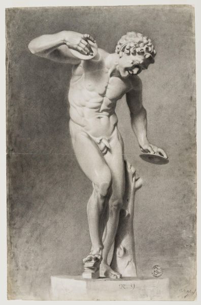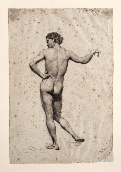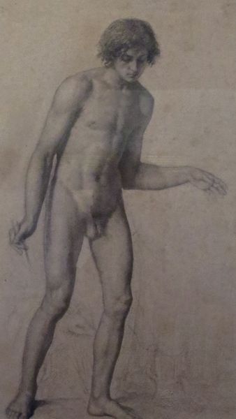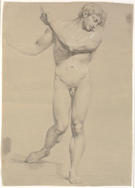 Editor: This is "Portrait of a Standing Young Man with Arms Raised," by Denman Waldo Ross. It's an oil on canvas. I’m struck by the figure's pose – it feels so dynamic, almost like he's dancing, but also vulnerable. What do you see in this piece? Curator: I see the legacy of academic training grappling with emergent ideas of physical liberation. Think about how traditional art academies used the nude male form to convey ideals, often tied to power and dominance. But here, the raised arms, the slight imbalance, suggest something different. Editor: So, it's a commentary on traditional power structures? Curator: Perhaps. Or at least, a questioning of them. Who gets to embody these ideals, and what does it mean to depict vulnerability instead of strength? It prompts us to consider the changing social and political landscapes of the time. Editor: That’s a perspective I hadn't considered. Now I see this as more of a statement than just a study of the human form. Curator: Exactly, art invites us to explore such possibilities.