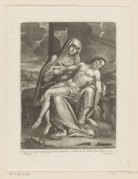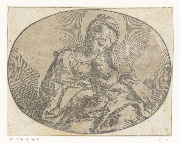 Editor: So, here we have “Maria met Kind en twee engelen achter een tafel met een mand met bloemen,” or “Mary with Child and two angels behind a table with a basket of flowers,” a 17th or 18th-century engraving by Guillaume Vallet. It’s quite serene, almost dreamlike in its monochrome palette. What strikes you when you look at it? Curator: It’s funny, isn't it? How devotional images from the Baroque period always seem to aim for this saccharine sweetness, a bit like honey smeared on everything. Look at how the figures are arranged - it feels like a carefully posed tableau, not exactly bursting with raw emotion, but brimming with religious symbolism nonetheless. The oval frame adds to that sense of staged reverence, wouldn't you agree? Editor: Definitely staged. Almost too perfect? All that said, do you find that perfection comforting or stifling? Curator: Stifling is a harsh word, though it resonates, of course. I think artists in that period aimed for divine beauty –an idealised, sanitized reality. It's a reflection of their worldview, isn't it? Everything meticulously rendered, to demonstrate skill and evoke reverence. Makes me wonder, what would it look like if someone painted a *realistic* Mary? Imagine! Editor: A more raw and "human" version would be...provocative, I guess. Looking closely at the basket of flowers, it almost seems like a symbolic offering or a promise of better times? Curator: Exactly! Everything signifies something. Each petal, each fold in Mary’s dress whispers volumes. I get a nostalgic ache seeing all that work put into making one piece that someone hundreds of years from then would ruminate on. Editor: I'll never look at Baroque art the same way. So many hidden meanings under layers and layers of beauty and perfect craft.