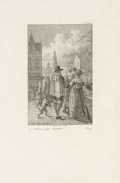 Curator: This engraving, created between 1750 and 1783 by Simon Fokke, depicts two separate scenes. Editor: My initial reaction is one of contrasts. The upper register seems overwhelmed by this monument that pierces the horizon line. Curator: The upper scene shows "Doorbraak van de Zuidhollandse Waard, 1421", the St. Elizabeth's flood, a catastrophic event in Dutch history. Below that, we see the “Huwelijk van Jacoba van Beieren en Frank van Borselen, 1434." It’s part of a historical series. Editor: Placing natural disaster beside marriage does raise interesting questions about historical constructions of agency and power. In thinking about the context, I wonder how the imagery operates within a larger socio-political narrative in 18th-century Netherlands? Curator: Certainly. Printmaking at that time often served a didactic purpose, reinforcing societal norms. These scenes, despite depicting events from centuries prior, would speak to contemporary concerns of leadership and national identity. Editor: And looking at the lower half, the marriage scene seems deliberately staged, almost theatrical in its composition. What's most striking is the dominance of the male figures: the groom and the clergyman officiating the marriage. Even surrounded by the figures in attendance, Jakoba appears almost passively at the scene, doesn’t she? Curator: That’s a very insightful observation, particularly given the complex story of Jacoba van Beieren’s rule, her multiple marriages, and her struggles for power. Her historical role is certainly filtered here. Editor: So this piece isn’t simply documenting the past, but actively shaping its memory in alignment with particular power structures, wouldn’t you say? This calls attention to whose stories are deemed worthy of memorialization. Curator: Precisely, by visually linking a powerful act of nature and a socially defining ritual in this fashion, it invites us to reflect on both fate and agency. Editor: Yes, examining historical visual media illuminates not just the historical events themselves, but the eras in which those images are made and seen. Curator: Thank you, that offers a powerful lens through which to view Fokke’s work, prompting considerations beyond the aesthetic appeal of this print.