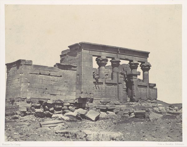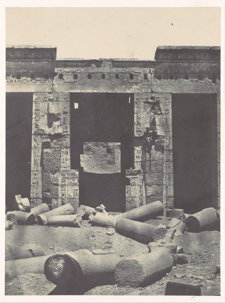 This is "Médinet-Habou, Propylées du Thoutmoseum; Thèbes," a photograph taken by Maxime Du Camp in the mid-19th century. Du Camp was part of a wave of European artists and intellectuals who traveled to Egypt, driven by the era’s fascination with antiquity and the exotic "Orient." This image captures the ruins of a temple in Thebes, inviting viewers to contemplate the passage of time and the decline of civilizations. It reflects the power dynamics inherent in the colonial gaze. As a Western photographer, Du Camp was capturing and framing Egyptian history for a European audience. The photograph presents the temple as a relic of the past, devoid of its original cultural context. What stories would this place tell if it could speak? How does viewing it through Du Camp’s lens affect our understanding of its history and significance? It prompts us to reflect on whose stories are told and how these stories shape our perceptions of different cultures and histories.