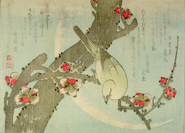 Editor: This print by Kitao Masayoshi, titled Society Finch, part of a series of imported birds, is just lovely. The delicate birds and foliage feel so light. What can you tell me about its context? Curator: This print speaks to Japan's engagement with the wider world. The "imported" nature of the birds highlights the era's fascination with exoticism and trade, but what does it mean to depict these birds in such a stylized, almost idealized manner? How does this relate to our own contemporary moment of global exchange? Editor: That’s fascinating! It makes me think about cultural exchange and how we represent the "other." Thanks for that insightful perspective. Curator: It is crucial to consider how these images participate in broader discourses of power and representation. Considering these questions helps us understand the work more deeply.