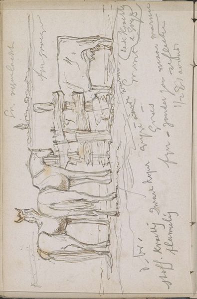 Curator: This is "Cow by a Wooden Feeding Trough" by Johannes Tavenraat, a drawing created sometime between 1854 and 1868, now held in the Rijksmuseum. It's rendered in pencil and pen on toned paper. Editor: The loose sketch quality evokes a peaceful rural scene; it almost feels as if I am intruding upon a private moment between animal and environment. I am interested in how that calm could intersect with our current anxieties around climate change and factory farming. Curator: Structurally, observe how Tavenraat utilizes delicate, light pencil work to delineate the form of the cow and the rustic texture of the feeding trough. It is the interplay between these very textures and the composition, its simplicity that is most engaging. Note also, the artist’s rapid pen strokes suggesting shadow and depth—a wonderful study in tonal variation. Editor: Indeed, though the visible handwritten notes disrupt that visual calm – a constant element to consider, the intersection between rural calm and legible notes and considerations, likely pertaining to local farmers’ names, observations and records of resource availability, thereby weaving larger narratives and struggles faced by agrarian communities. How might this interplay confront power imbalances of agrarian labor systems then and now? Curator: It is compelling, the relationship established through the figure-ground relationship between foregrounded sketch and its ground and context as a study. The pen work serves to not simply illuminate meaning beyond simple representation, but imbues with deeper representational qualities. Editor: For me, the personal feel evokes broader ecological and historical implications. If Tavenraat’s cow witnessed its landscape shifting drastically, the drawing invites pondering current biodiversity loss stemming from extractive capitalist structures – the politics of the ordinary that impacts all life, both human and nonhuman. Curator: Perhaps that "personal feel" speaks directly through a particular aesthetic register achieved through attention to material presence. An evocative interplay nonetheless. Editor: Yes, exactly, one worthy of continuous re-evaluation against complex, dynamic change.