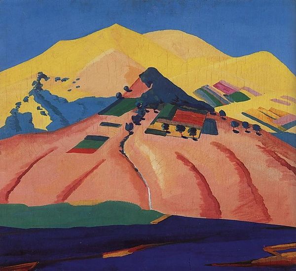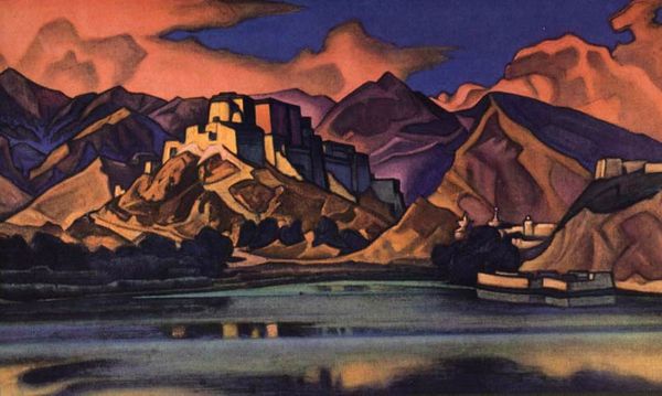 Curator: This is "The curtain of the State Drama Theater of Armenia" painted by Martiros Sarian in 1923. It’s a vibrant piece, incorporating tempera and oil paint, even reminiscent of fresco techniques in its large scale. Editor: The colors are extraordinary; it almost feels like looking at a dream. A very tactile one at that. The materiality, the thickness of the paint… I wonder about the weaving of the canvas itself. It feels rough, perhaps even repurposed. Curator: Sarian was deeply invested in portraying Armenia’s cultural identity and promoting cultural institutions in Armenia. This curtain becomes symbolic of a gateway to national stories being told on the stage. Imagine the anticipation it would generate! Editor: It’s fascinating how the stylized landscape pushes against any true sense of depth. The geometric forms of the mountains, the shapes of the trees, it's all very flattened, yet it feels grand because of its sheer size for a stage. Were locally sourced pigments employed, I wonder? Curator: Very likely. Sarian was actively participating in nation-building efforts after the establishment of the Armenian Soviet Socialist Republic. His artistic vision significantly shaped Armenian visual culture. The imagery borrows from a pre-existing artistic visual language of Armenian culture and history, reimagined for a new sociopolitical context. Editor: This melding of art, craft and labor really makes you consider how audiences would experience performance back then. There is such attention to form but what does the canvas making tell about labor involved and accessible at the time? Did people discuss who makes theatre versus what ends up on stage? Curator: The interplay between folk traditions and modernism is so evident here. You have a landscape depicted with an almost mythical quality but composed in a distinctly modernist manner. This theater piece really encapsulated an emerging modern national identity. Editor: And considering the history of the theater itself adds a fascinating layer. It served not just as a cultural center, but perhaps as a visual statement of Armenian artistic capability in the period. Curator: Absolutely, thinking about the curtain in the broader context, it's more than decoration. It represented aspirations for a new era, the power of art to create social and political meanings in national projects. Editor: Agreed. When considering it not only for its image, but for the process and resources to construct, this art piece brings a much richer significance in imagining art's influence on the country's artistic production today.