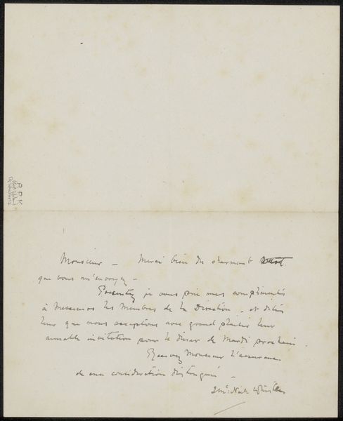 Editor: Here we have "Brief aan Philip Zilcken," made before 1916 by Georges A. Tournoux, in pen and ink. It’s so delicate; the cursive script gives it a very personal feel. What stands out to you about this letter? Curator: I see echoes of shared social language. This isn't just a message; it's a performance of social graces through handwriting and rhetoric. Note the elegant script and formal address, 'Monsieur'. It performs a ritual of respect. The symbols – did you notice the decorative crest at the top? – suggest a desire for connection to an established social order. Who was this Zilcken and what did their family represent? Editor: It seems almost performative, in that sense, adhering to a certain decorum of the time. Curator: Precisely. Every stroke of the pen contributes to a persona carefully presented to the recipient. The very act of writing, with its implied duration and intimacy, suggests a deliberate attempt to bridge a social gap or maintain a connection despite possible distances. We can learn from each word choice in written and visual correspondence. What assumptions is the sender making, and does this mirror how people perform in today's society, like, say, in text-based communication? Editor: I hadn't thought about it in terms of "performance," but that makes sense. Curator: The intimate act of sending letters now exists almost solely in this symbolic sense, as correspondence. It becomes a symbolic act – almost performative – of acknowledging another’s place in one's symbolic order of the world. The letter stands in place of the writer. Editor: So much history embedded in a simple letter. I see that letters transcend mere communication, functioning as curated symbols of social roles. Curator: Indeed. The images used in that era became, through consistency of messaging, memory anchors to build community and signal personal expression.