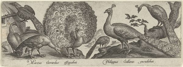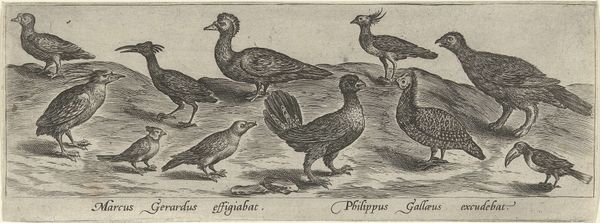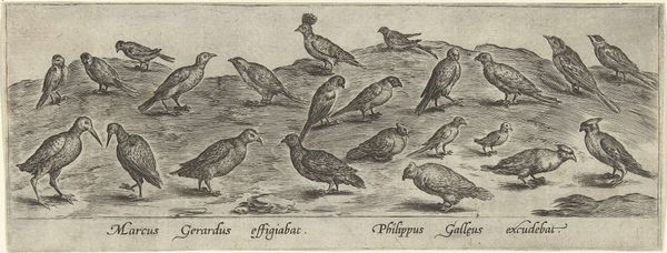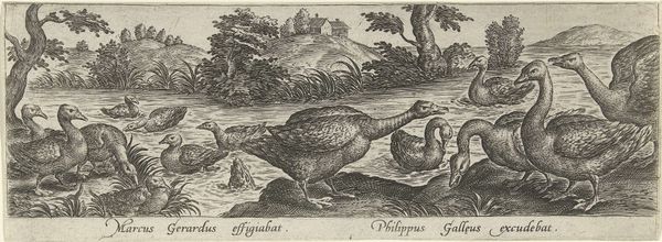 Editor: This is "Zeven Ganzen," or "Seven Geese," an engraving made sometime between 1547 and 1590 by Philips Galle. The rendering is so precise! What do you notice first about its composition? Curator: I am drawn to the interplay of light and shadow, particularly the way Galle uses hatching and cross-hatching to define the form of the geese. Consider the varying density of lines. Where do they suggest volume and depth? Editor: I see it in the way the light seems to hit the leftmost goose compared to the one bathing at the front. How did the position of the figures impact the final outcome of the piece? Curator: The placement directs the eye from left to right, moving through a variety of poses. Some geese stand, others bathe or rest. Have you considered how these compositional decisions emphasize the inherent rhythms and patterns? Editor: It almost looks like they are placed like musical notes on a page! And each goose has its own character and distinct place. The artist must have spent lots of time closely watching these creatures. Curator: Exactly. What do the shapes create, and how does Galle guide our viewing experience to make us observe it? Editor: That’s a useful framework. I will use this compositional approach with future pieces. Curator: Indeed. We’ve unpacked Galle's piece using a keen focus on shape, line, and tone. This exercise provides valuable insight.