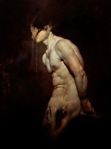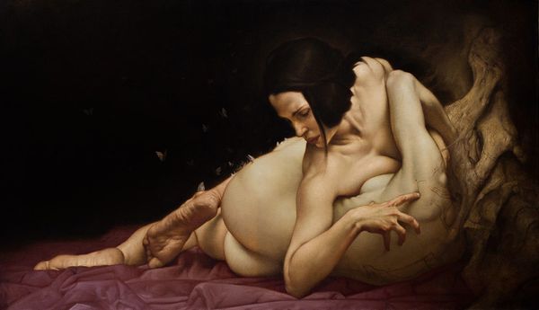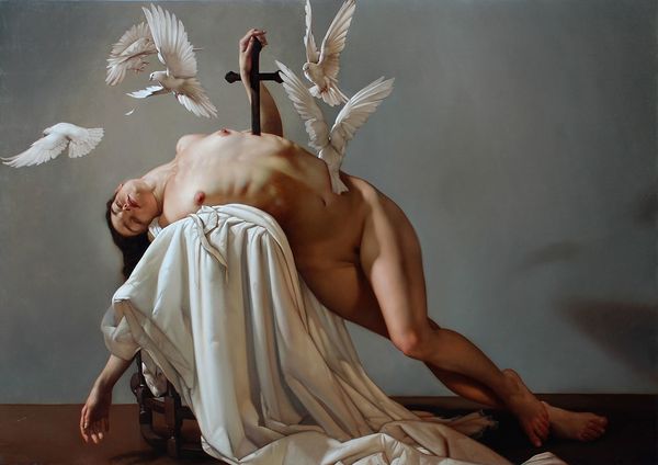 Editor: We're looking at "Pietas," an oil painting by Roberto Ferri from 2015. The figure is nude, partially covered with white drapery, lying next to a skeleton... it's striking how tender the moment feels, despite the presence of death. What do you make of this piece? Curator: It's powerful, isn't it? Ferri deliberately evokes historical paintings, referencing Mannerism and academic art, styles deeply intertwined with patriarchal structures. He uses a classic “memento mori,” the skeleton. But placing it next to a living, female body complicates the typical message about vanity. Doesn't it make you question who is allowed to represent whom, and why? Editor: It does. The woman’s gaze is directed down, seemingly filled with grief, so the 'Pietas' theme becomes very overt. I’m wondering what commentary is made through this modern interpretation, how can this symbolism inform queer or feminist themes? Curator: Exactly! Consider the historical power dynamics often embedded in paintings of the female nude, especially when juxtaposed with death. Ferri seems to be asking us to confront that history, to acknowledge both its beauty and its troubling undertones, while presenting this vision from his own male gaze. Do you think he succeeds in truly subverting the power dynamic, or does he just reproduce it? Editor: That's something I need to think more about, but I appreciate you pointing out the importance of deconstructing gender and identity within art like this. It highlights not just mortality, but how power and representation function. Curator: Precisely. And that, to me, is the value of engaging with art like Ferri's. It's not just about beauty or technical skill, it's about unpacking complex social and historical dialogues. Editor: Thanks, I see the painting in a totally different way now, particularly in relation to art-historical context.