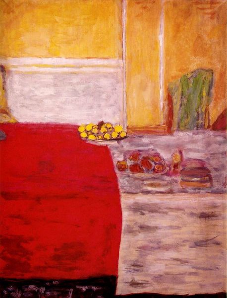 Editor: I’m intrigued by Iwo Zaniewski’s "Chair, Table and Armchair," an oil painting with an understated charm. There’s a sense of quiet domesticity here, a pause in a day. The almost hazy quality to the light makes me wonder, what story do you think this arrangement of objects is trying to tell? Curator: Story… Now you’re asking the million-dollar question! It's almost like a stage set, isn’t it? The vibrant orange hues battling with the grassy green behind the table make me think of clashing memories—perhaps a longing for summer when stuck indoors. It feels intimate, like glimpsing into someone's personal space and their mental landscape at the same time. But why these objects? Editor: The chair pulled away from the table gives a sense of abandonment almost? I am thinking that the placement of a single armchair seems to welcome you into the space. It might be suggesting solitude but also an invitation. Curator: Absolutely. It’s an interesting paradox. You know, I sometimes think that these kinds of compositions are less about what's physically present, and more about what’s conspicuously absent. Who sat in that chair? Who will take up that invitation? Are these portraits without figures? Are we meant to supply the missing characters, weave ourselves into the narrative? Editor: That’s a great question. So the viewer becomes part of completing the story in their mind's eye. The painting offers itself like a diary, you fill in the experiences or memories as you interpret the images. Curator: Precisely! It whispers rather than shouts, doesn't it? This picture resonates with an intimate invitation and introspective quietness that remains for hours. Editor: Thank you, this helped bring so much more nuance and texture to the painting.