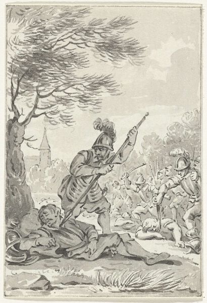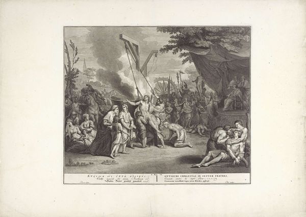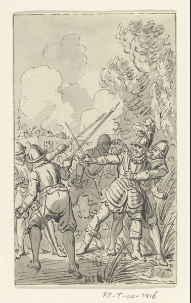 Simon Fokke's engraving, "David mistrusted by the Philistines," presents us with a scene of rising tension, dominated by the contrasting figures of David and the Philistines. David stands with open arms, a gesture of vulnerability, yet he's surrounded by Philistines brandishing torches and spears, symbols of aggression. The torch, a recurring motif, not only illuminates but also threatens, evoking primal fears of the unknown and the untamed. We observe the lyre lying on the ground. Consider the open arms. We see it echoed across centuries, from ancient orators to Christ on the cross, embodying supplication, truth, and surrender. But here, amidst the distrust of the Philistines, the gesture takes on a poignant irony, revealing a deeper, perhaps subconscious, human struggle between innocence and suspicion, acceptance and rejection. The image captures a volatile moment, charged with the psychological weight of collective anxiety, fear, and the eternal human drama of trust betrayed.