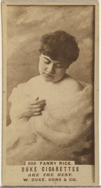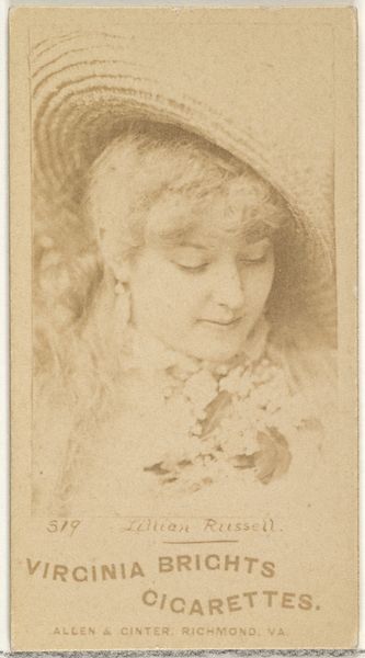 Editor: Here we have "Actress from the Old Judge series," a promotional print made around 1886 by Goodwin & Company. The lithograph rendering makes me think of a memory: distant, slightly faded, but familiar. What layers do you see in its symbols? Curator: A potent question. Images of women, especially actresses, were used to imbue products, like cigarettes, with aspirational qualities: beauty, sophistication, and performance. These figures weren’t just selling a product; they were selling a dream. How does the phrase "Old Judge" sit with the image, and does it disrupt your first impressions? Editor: It clashes a bit. I initially focused on the actress’s soft, inward gaze, a romantic feel almost, but the "Old Judge" text pulls me back to its commercial purpose. Does this dissonance serve a function? Curator: Absolutely. It introduces a duality. "Old Judge," likely suggesting wisdom and reliability, is juxtaposed with the fleeting beauty of the actress. It plays on the transient nature of fame, while attempting to assure the lasting quality of the product. Notice how she holds herself, it recalls modesty, an alluring symbol to cultivate a consumer's memory. Do you see an invocation of the visual vocabulary of advertising that remains potent even now? Editor: I do. It's strange how a little image on a cigarette card can be so layered with cultural meaning. I'll definitely look at these differently from now on! Curator: Indeed, it's a testament to the enduring power of images to convey layers of meaning across time.
