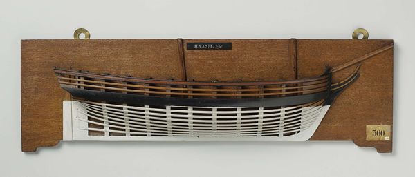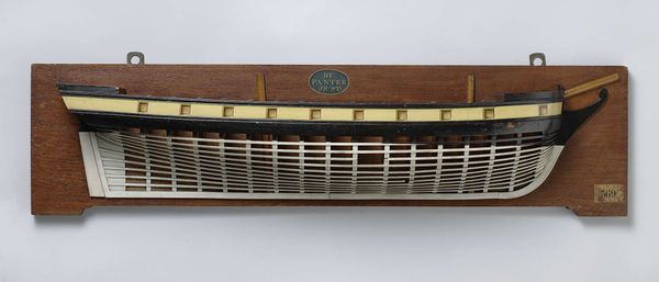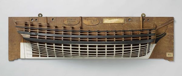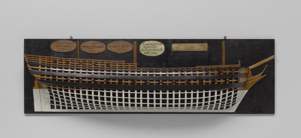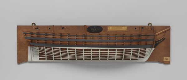 Curator: Editor: So, this is a “Half Model of a 74-Gun Ship of the Line,” made around 1806, artist is anonymous and created with wood. It looks incredibly precise. What strikes me is the layering – how does this construction influence your perception of it? Curator: The model presents an interesting problem of representation. We have a three-dimensional object, a ship, rendered in partial form as a two-dimensional relief. The layering you note becomes crucial; it's not merely decorative but structurally informative. Notice how each layer articulates a different plane of the ship's hull, moving from the outer skin to the inner framework. Editor: Ah, so the layered effect isn't just aesthetic; it's integral to understanding the ship's structure! How do the contrasting materials, the dark and light wood, play into this representation? Curator: The colour differentiation heightens the visual complexity. The darker, heavier woods delineate the outer form and provide a strong linear element, anchoring the model. In contrast, the lighter wood seems to represent the interior structure. What about the lines - does this linear emphasis clarify or complicate the form in your view? Editor: It’s almost like an architectural drawing rendered in three dimensions! The lines create both a sense of order and depth but they are also very repetitive; but I’m still curious as to why someone would only do half of it instead of the full vessel. Curator: Precisely! The linear framework serves as a scaffold upon which the eye can reconstruct the full volume of the ship. The half form isolates the essential structural information which shifts focus away from the ornamental or superficial. The half model embodies abstraction by reducing something whole and functional to a network of formal relations. Does this reading resonate with you? Editor: It does, now that you point it out. I now see the interplay of materials, the layering, the lines as more than just design elements—they’re a language, an intricate diagram almost. Thank you! Curator: Indeed. Observing the parts helps to clarify the whole.