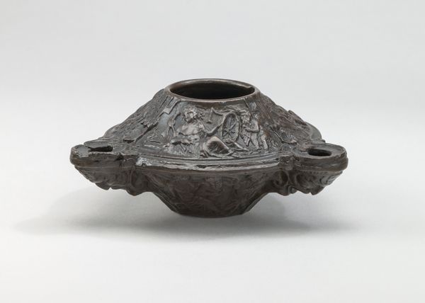 This is a salt-glazed stoneware "Komfoor", or stove, made by Joseph Mendes da Costa, but without a specific date. It’s all about process with this object: it's very tactile, rough and ready. You can see how the artist plays with the thickness and texture of the clay. It's a reminder of the earth, of something elemental. Look closely at the little circular details around the side – they create a rhythm, a kind of visual heartbeat. They also give the object a slightly industrial feel, like rivets on a machine. The dark glaze pools in the recesses, highlighting the form and adding depth. I love how the artist embraces the imperfections of the medium. It’s like he's saying, "Here it is, in all its messy glory." It reminds me of some of the early studio pottery of Lucie Rie – a celebration of craft and the beauty of simple forms. Art is an ongoing conversation, and this piece is a great example of that.