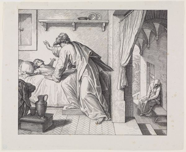 Curator: Jacob de Wit rendered this pen and ink sketch, titled "De wonderbaarlijke hostie in de as teruggevonden," sometime between 1705 and 1754. Editor: It has a dreamlike quality. The monochrome palette and fluid lines give it a sense of ethereality, as if glimpsed through memory or faith. Curator: Observe how de Wit employed hatching and cross-hatching to define form and volume. The composition is cleverly arranged to lead the eye from the foreground figures towards the background activity. Editor: The artwork depicts a miraculous scene—specifically the recovery of a consecrated host from ashes. Consider its implications for power structures within the church and the ways these are made accessible to public imagination through imagery. Curator: It is precisely through careful study of line, light, and shadow that de Wit creates a sense of dramatic tension. Semiotics decodes the symbolic placement of figures—nuns and heavenly angels overseeing a miraculous occurrence. Editor: It is vital to ask—how would different viewers throughout history interpret this representation? Who is empowered, and who is marginalized? How is this moment used to reinforce spiritual belief systems in both public and private devotion? Curator: De Wit orchestrates light and dark areas strategically. Notice how light catches the robes of the standing nuns, drawing focus to their reaction while framing the shadowed area where the miracle unfolds. Editor: The drawing, created in a period steeped in religious reform, reveals the socio-religious turbulence reflected in popular spirituality and its representational limits. It pushes us to examine how sacred subjects enter a public sphere that impacts intersectional understanding of faith. Curator: Precisely. And it is in de Wit’s capable hands that we view an exemplar model of structural ingenuity, as the sacred space comes to life. Editor: Ultimately, viewing the history surrounding an artwork makes understanding and reacting to works of art a much richer activity.