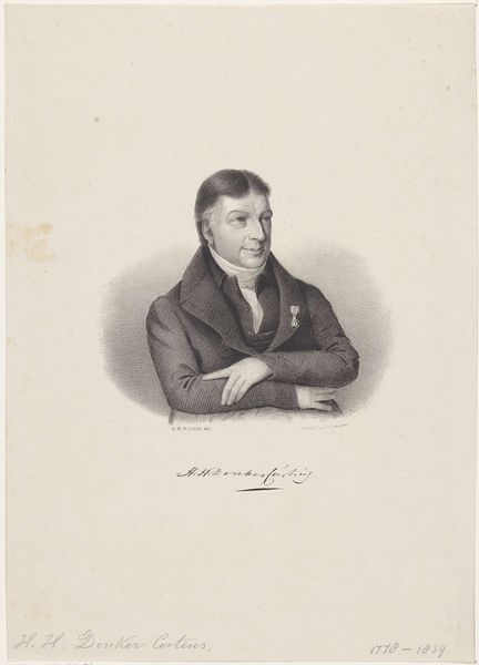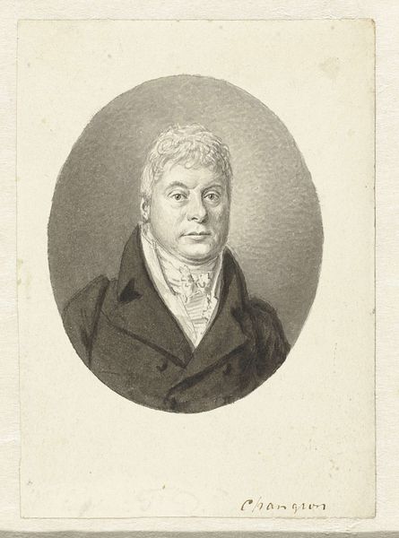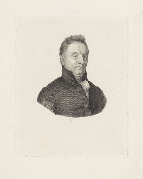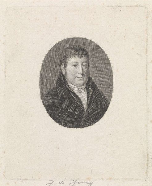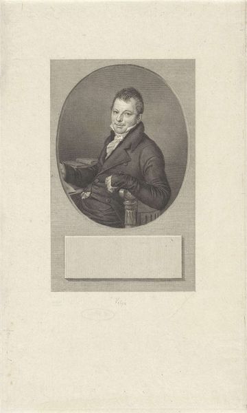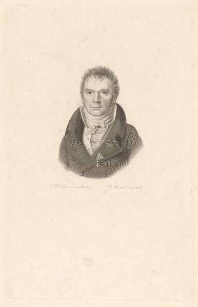 Curator: Before us is an engraving titled "Portret van Jacobus Scheltema," created in 1818 by Jacob Ernst Marcus, residing here at the Rijksmuseum. It's a striking portrait. Editor: It does seem to have an almost melancholy air. Despite the clear skill in its execution, there is a certain gravity to the man’s expression. Curator: Considering Scheltema’s background as a philologist and historian, such seriousness might reflect the weight of knowledge and responsibility he carried within his intellectual pursuits. We see him framed by that oval, almost as if in a looking glass—an object we have used to signify introspection, contemplation, even the shadow of mortality. What cultural layers does the medallion hint at for you? Editor: Well, medals often speak to service—loyalty to a state or a cause. And I notice it is shaped like the Maltese Cross, which does have specific connotations. Is there more than meets the eye to the social role he performs? How was Scheltema seen, and how did he see himself in relation to Dutch society and its complex power structures following the Napoleonic era? Curator: Precisely! How the cultural, religious and political identities converged for people like him—it must be examined within the shifting landscape of early 19th century Europe. And those symbols certainly played into it all. I'd further consider how class and gender operate within the depiction—his attire, the crisp linen of his jabot, marking a certain social standing. Editor: The crisp lines definitely denote seriousness and rigor. A figure embedded in the cultural narrative, seen through controlled lines. This gives a certain impression and hints at other facets. Curator: It offers such an insightful window into the formation of individual and national identity in the wake of transformative social change. It allows us to discuss ideas that are still current today, like identity and political engagement, viewed through the symbols, clothes and gazes present in the picture. Editor: Indeed. What initially appeared as a sombre portrait unfolds into a compelling examination of selfhood and status, brought to life by your analysis.