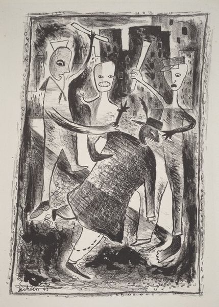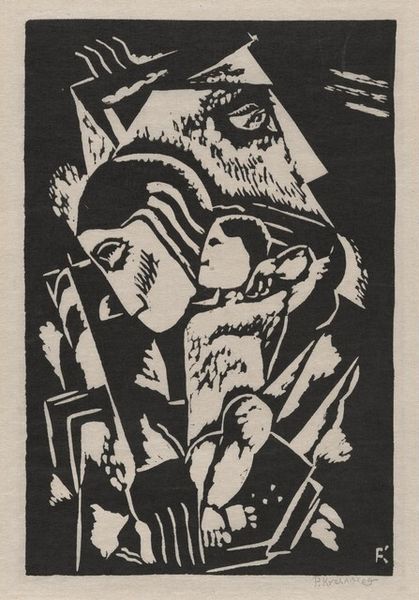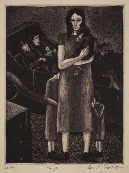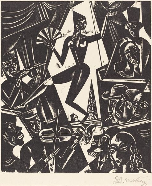 Editor: This woodcut, titled *Gods' Man, A Novel in Woodcuts*, created by Lynd Kendall Ward in 1929, has a very stark and almost theatrical feel to it. The high contrast and exaggerated expressions of the figures are really striking. What sort of narrative do you see unfolding here? Curator: Lynd Ward truly captures the spirit of his age, doesn’t he? I see symbols layered within symbols. Note how the woman, the most brightly lit figure, is framed; seemingly offered as a commodity by that grinning man in the foreground. What does that gesture evoke for you, within the larger narrative implied by the title? Editor: I hadn't really thought of her as a commodity...more like she's aware of her surroundings? What kind of connections might Ward be drawing between individual experience and the broader, possibly corrupt, societal forces at play here? Curator: The faces in the background, almost a chorus, seem to fixate, or are they leering? Their uniformity of dress and expression suggests a specific social stratum complicit within the capitalist system that devalues humanity. Have you ever encountered that particular contrast between light and dark in other cultural artifacts depicting societal struggles? Editor: Not quite in this explicit manner, no. So the visual language here isn’t just about aesthetics; it’s communicating the social commentary about power, exploitation, and possibly even loss of innocence, using archetypes. Curator: Exactly! And recall that wordless novels became really powerful, accessible formats during periods of social unrest. By using stark contrasts, simplified figures, and dramatic compositions, Ward really hit the emotional tone of his historical time, as we’re still sensitive to these stark visuals now. Editor: Thanks, that makes Ward’s choices here even more compelling! I am rethinking my understanding of those faces in the background. Curator: That's the beauty of art, isn’t it? Continual questioning, revising our perspectives…and seeing reflections of ourselves across time.