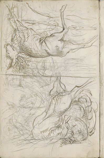 This drawing, "Sheet of Studies," of unknown origin, employs the straightforward materials of paper and graphite. The artist uses these humble materials in a complex process of layering and sketching, to give form to scenes with figures in dynamic motion. We can see how the varying pressure and density of the graphite lines create a sense of depth and volume, and how the artist returns to contour the figures and forms. The paper's rough texture and the deliberate, yet unfinished quality of the drawing, provide insight into the artist's working method, and their desire to experiment with composition, anatomy, and expressive line work. It reminds us of the labor involved in artistic creation, and the many hours of practice and refinement that lie behind a finished masterpiece. Appreciating the art of drawing involves an acknowledgement of these basic materials and processes.