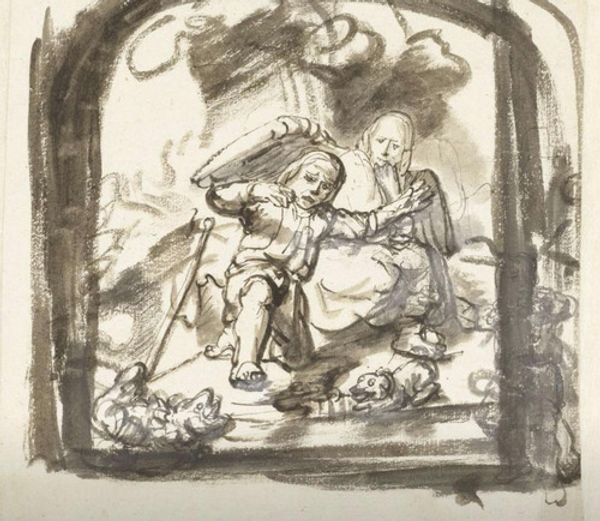 Curator: This charcoal and pencil sketch, “St. Dorothy with the Basket of Flowers,” was rendered circa 1520 by Matthias Grünewald. It resides now in the Gemäldegalerie, Berlin. The delicate linework gives the figure a palpable sense of movement despite the stillness of her pose. Editor: Yes, there's an ethereal, dreamlike quality to this Saint Dorothy. I find myself wondering about the context in which she lived. Was she truly a vessel for hope in her time? Curator: Saint Dorothy, the patron saint of gardeners, florists, and brewers, occupies a poignant intersection of sacrifice and reward. It’s all tied to the imagery of spring, rebirth. The basket itself and the flowers she carries signify divine favor and the promise of eternal life. Editor: And there's the angel, perched by the edge of what appears to be an entrance, gazing out almost longingly. Is this also tied to hope and reward? It feels more somber, if I'm honest, as if it's about unfulfilled potential. We know Dorothy's story is linked with defiance. In refusing to denounce her beliefs, she was, arguably, a potent figure of resistance against systemic oppression. Curator: The symbols are powerful carriers of her story! Even her serene gaze, directed downward, invites contemplation rather than direct confrontation. It speaks of inner conviction, unflinching faith made tangible. Her soft lines communicate grace, especially considering her heavy narrative burden. Editor: Right, and think of that era; the power imbalances inherent in those institutions. Grünewald portrays Dorothy as more than just a martyr. In every stroke, he is reminding us about standing strong with your beliefs against insurmountable odds, especially during a time marked by stark gender inequality and religious persecution. Curator: Grünewald indeed used symbolism and iconography not just as adornment, but as powerful conduits of belief. We can read Dorothy’s entire saga through those seemingly small pictorial details. Editor: And seeing this portrait today, Dorothy offers a renewed conviction about speaking out in the face of our contemporary oppressions, be they systemic, social, economic, religious, or political. Her defiance is ever-relevant. Curator: A very important interpretation and emphasis! It enriches our understanding greatly, while revealing aspects beyond simply hagiographic significance. Editor: Precisely.