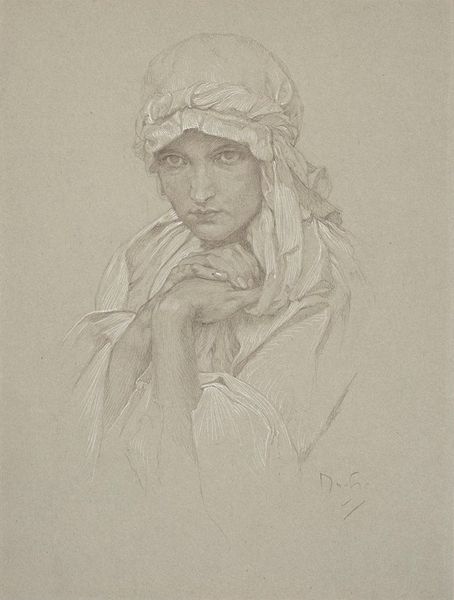 Editor: Here we have Alphonse Mucha's drawing, titled "Daughter", made with pencil. It feels incredibly delicate. What is striking to me is the interplay between the finished face and the sketched clothing. How do you see this composition? Curator: Indeed, the contrast is compelling. Note how the meticulous rendering of the face, especially the play of light and shadow around the eyes and mouth, establishes a clear focal point. Consider the lines that define her profile and headscarf, sharply defined and precise compared to the fluid lines delineating her garment. The question then becomes, what purpose does this duality serve? Editor: Perhaps it directs our gaze, prioritizing her expression over her attire, telling us where the artist wanted our attention to be focused? Curator: Precisely. And observe how the embroidery pattern, though less detailed than her face, still uses repeating motifs and strong contrast to balance out the headscarf, thereby reinforcing a vertical axis within the image. This is no mere portrait; it is a calculated arrangement of forms and lines to communicate meaning. The interplay reminds me a bit of cubism or collage--of foreground and background. The technique calls attention to the surface as a constructed image, not merely a reproduction. Editor: So it is in this artistic tension that Mucha directs our eyes to the details, guiding our interpretation of the sitter? Curator: Precisely. And furthermore, this is a clue, maybe he meant "Daughter" more conceptually? Mucha wasn't simply depicting her outward appearance but conveying her essence through artistic structure. This encourages us to really *see* the image. Editor: It's a different way to see portraiture – going beyond likeness to structural composition. I'll never look at portraits the same way! Curator: Hopefully this will have people see Mucha's composition anew.