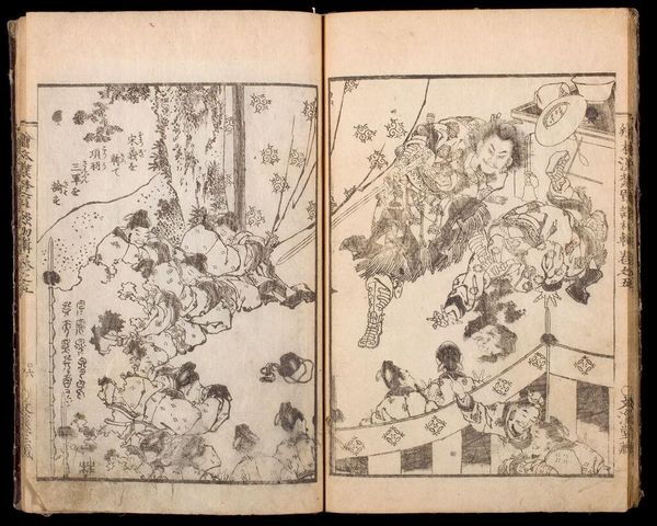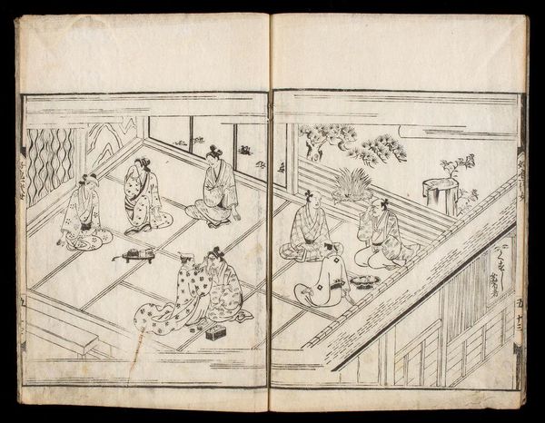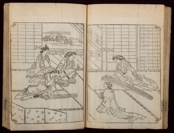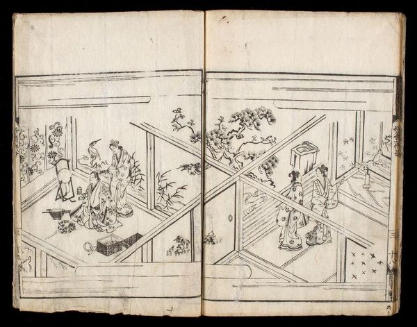 Editor: Here we have "Letters of Returning Geese," from "The Stone Monument of Ishibumi", it is attributed to Ishikawa Ryūsen. It looks like a page from a printed book. I’m struck by how much detail is captured with such simple lines. What do you see in this piece? Curator: I'm captivated by the subtle contrast: one figure seemingly waiting, the other immersed in study. Perhaps it speaks to the push-and-pull between tradition and progress, or the quiet dramas unfolding within domestic spaces. It’s a very contemplative image; do you think the geese represent a longing for something more? Editor: I hadn't thought of that, but it adds a new layer of depth. It's interesting how much can be read into a single image. Curator: Indeed. Art often holds a mirror to our own experiences, reflecting our hopes and curiosities.