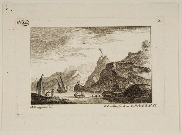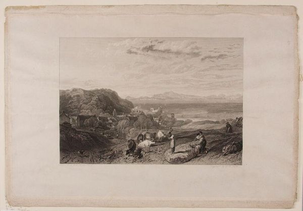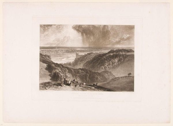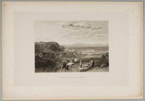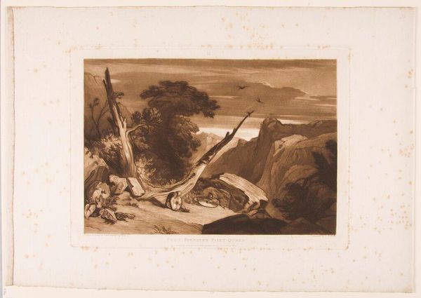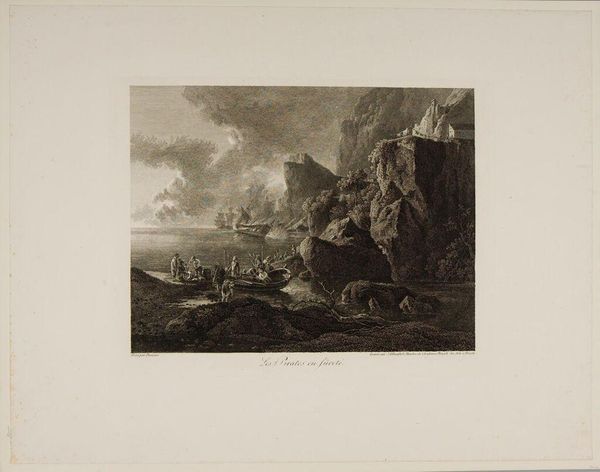 Editor: This is an etching by J.M.W. Turner, titled "Martello Towers near Bexhill, Sussex." It’s… sepia-toned and sort of brooding, but also strangely peaceful. What do you see in this piece? Curator: Well, it’s Turner, so immediately I'm thinking about light, or the lack thereof. The scene feels heavy, doesn't it? The looming cliff, the dark sky. I wonder if he's playing with the idea of England's vulnerability, the towers standing as lonely sentinels against a potential invasion. Editor: Invasion? I was just thinking about a nice day at the beach. Curator: (Laughs) Ah, yes, the beach! But Turner was always one to find the sublime in the everyday, wasn't he? Perhaps it’s both: a beautiful scene touched by a hint of unease. Editor: I guess it's a good reminder that even beauty can have a dark side. Curator: Exactly. And that’s what makes it so compelling, don’t you think?