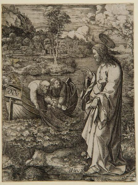 Editor: Here we have Cornelis Cort's "Temptation of Christ," a 16th-century engraving. The stark contrast really highlights the tension between the figures. What symbols jump out at you? Curator: The Devil's pointed finger, echoing Christ's own gesture, speaks volumes. Consider the halo, its circular form a well-established signifier of divinity, juxtaposed with the rugged landscape. How does this setting inform your reading? Editor: It feels desolate, like a spiritual testing ground. Curator: Precisely. The city in the background—a symbol of worldly power. Note the placement of additional figures on the cliff, witnessing from afar. Can you find any other symbols that support the narrative? Editor: I see the rocks and trees, suggesting a wild, untamed place, a place of danger. Curator: True. This image reminds us that even in isolation, our choices shape our spiritual path. Editor: I never considered how composition could reinforce such a familiar story!