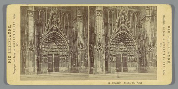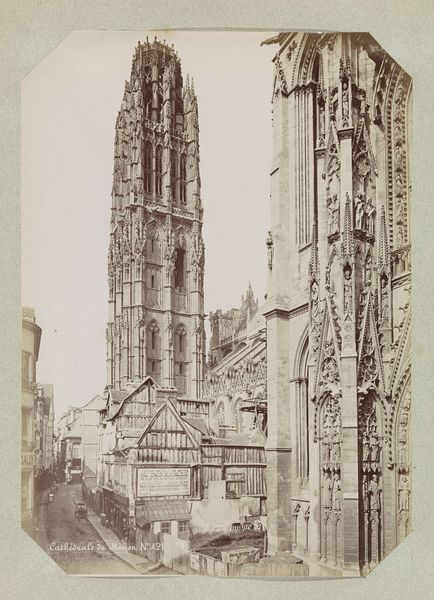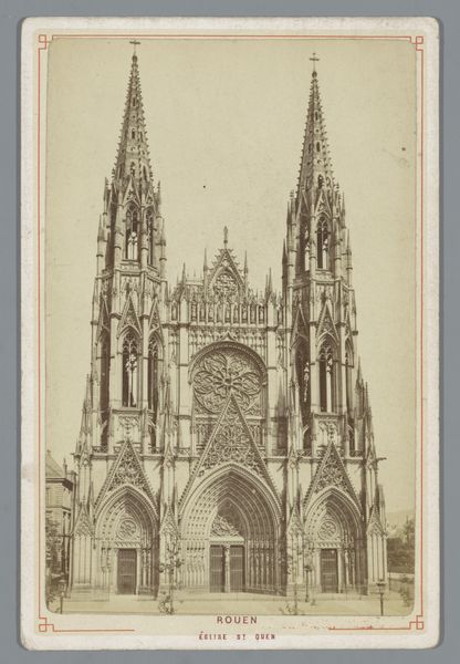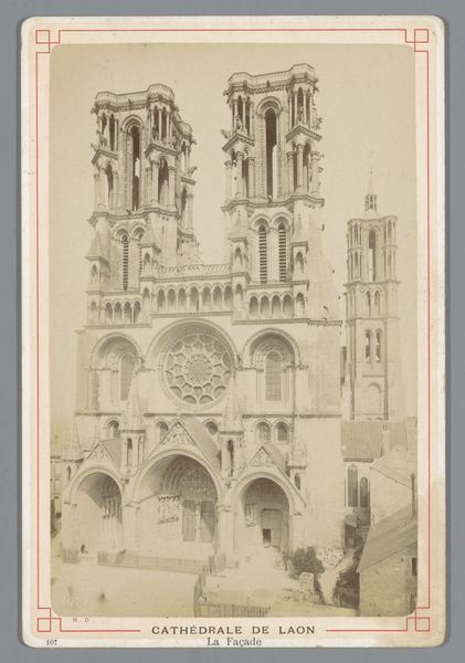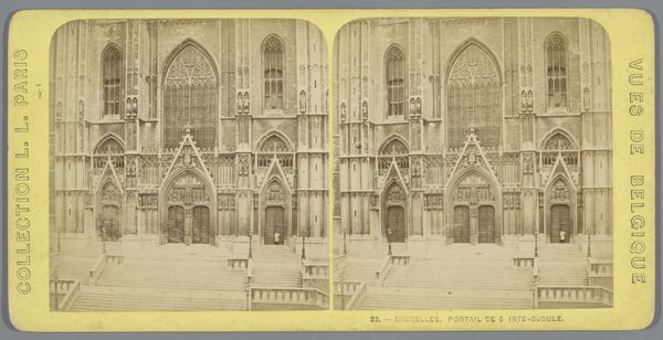 Editor: So, here we have a photograph from the late 19th century, sometime between 1873 and 1890, of the facade of the Cathedral of St. Michael and St. Gudula in Brussels. The photographer is unknown. It's striking, the stark geometry, like a cathedral trapped in amber. What stands out to you in this image? Curator: Amber! Yes, what a wonderfully evocative way to put it! It makes me think of petrified history. It's more than just a picture of a building; it’s an encounter, isn’t it? A meeting between then and now. The anonymous photographer—what were they hoping to capture, do you think? Was it just documentation, or was there something more, something of their own soul reflected? Editor: Hmm, I guess documentation at the time, perhaps? But maybe that very desire for "pure" documentation is, in itself, an act of interpretation. This very still image… how do you think its stillness affects its meaning? Curator: The stillness amplifies the weight, doesn’t it? It invites a deep consideration of time and presence, not only of the cathedral's enduring existence but of our own fleeting moment with the photograph. The gaze, unblinking, that holds two worlds. It is a silent shout, if you will. Don’t you think? It urges a silent contemplation. Editor: I see what you mean. It makes you think about what the building has seen, what it represents. All those years silently witnessing history. I initially saw this photo as just a cityscape of the facade, but it almost becomes like a portal through time. Curator: Absolutely! And doesn't this new found relationship with an ‘old’ picture affect our day to day life now? It all blurs in a wonderful mesh.