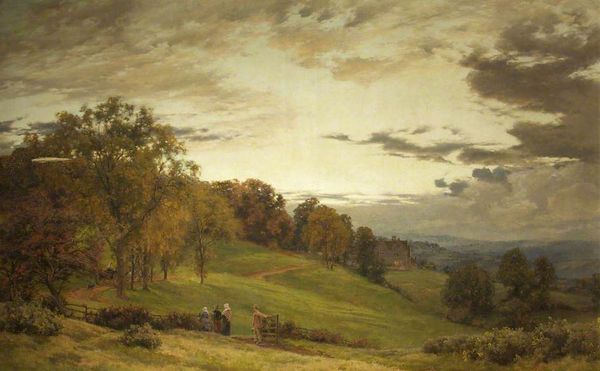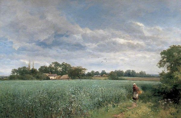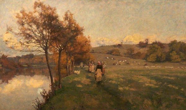 "On the Avon near Stratford" by Alfred Parsons, presents a landscape composed with gentle harmony and a tonal palette. The eye is immediately drawn to the contrast between the earthiness of the lower register and the openness of the sky above. The composition directs our gaze along the winding path, punctuated by the figure and the flock of geese, leading toward the tranquil river and distant landscape. The path and river function as lines that pull the painting together while separating fields. The artist uses the semiotic tools of color and form to evoke a sense of rural calm. The darker foreground acts as a stage, setting the scene for the more airy and illuminated middle ground. Parsons captures a moment of pastoral life, framed within a structure that carefully balances detail and atmosphere. The painting's enduring appeal lies in its structured yet naturalistic depiction, offering a serene view that invites contemplation on nature.